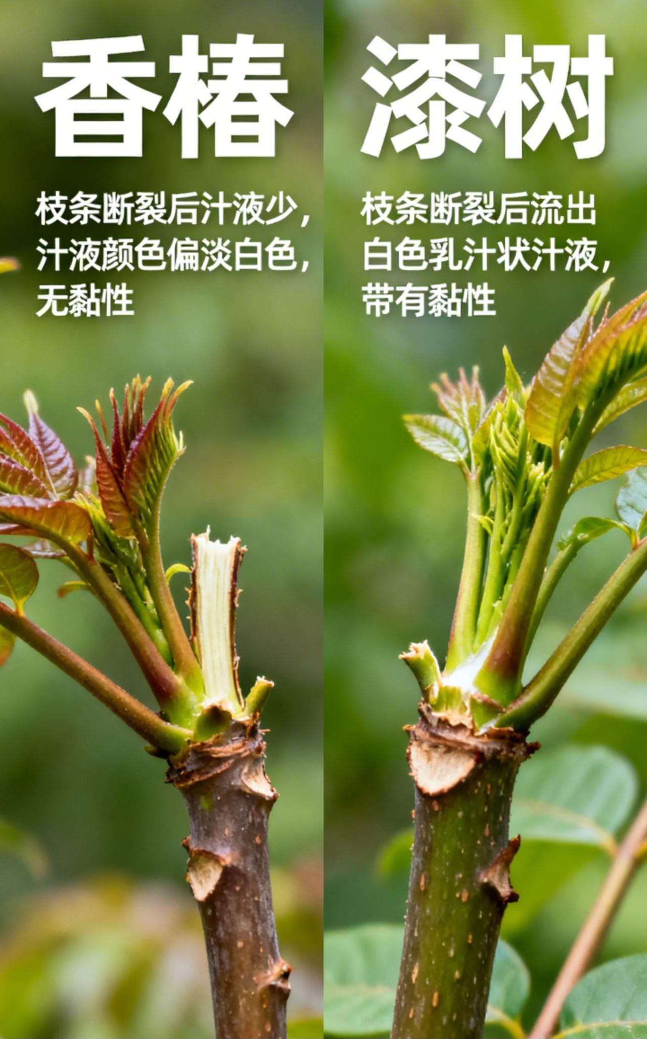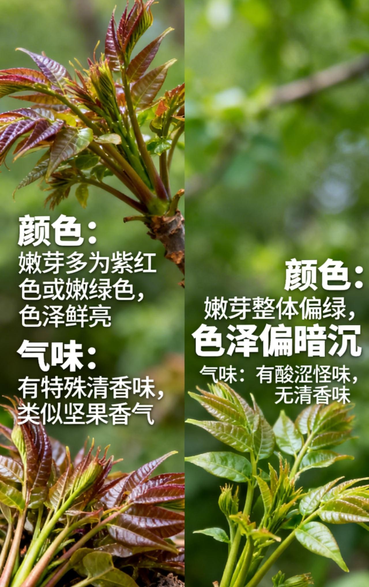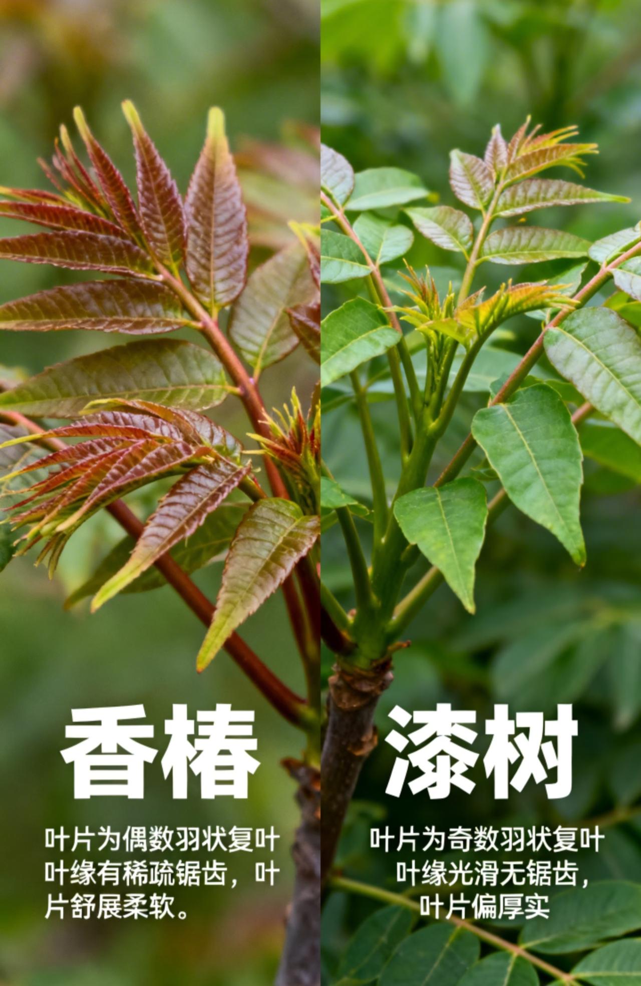 一分钟带您认清香椿芽&漆树芽! 又到了春季吃香椿的季节, 会有很多朋友去郊外采摘香椿。 不过每年都会有很多朋友由于不认识, 误把漆树芽当成香椿芽采摘。 这种情况非常危险! 所有今天通过简短的介绍, 来跟大家聊聊香椿芽&漆树芽的区别! 1️⃣ 叶片形状 ▪️香椿:偶数羽状复叶,叶缘有稀疏锯齿,叶片柔软舒展; ▪️漆树:奇数羽状复叶,叶缘光滑无锯齿,叶片偏厚实; 具体可看图二! 2️⃣ 颜色气味 ▪️香椿:香椿的嫩芽多为紫红色或者嫩绿色,叶子自带独特的清香味; ▪️漆树:漆树的嫩芽整体呈现偏绿色,味道上没有香味,有股酸涩的怪味; 3️⃣ 汁液 ▪️香椿:香椿的枝条折断后汁液少,颜色偏淡白,没有黏性; ▪️漆树:漆树枝条折断后会流出白色乳汁状汁液,带有黏性; ⚠️ 重要提醒: 由于漆树芽含有漆酚等有毒物质,误食后会引发皮肤红肿过敏、恶心呕吐、腹痛腹泻,严重时会导致中毒性休克,所以大家在野外见到不认识的嫩芽一定要进行仔细辨别,以免发生危险!!! 香椿 香椿食谱 漆树 香椿苗采收技巧 香椿苗鉴别 野漆芽 香椿芽采收方法 济南香椿