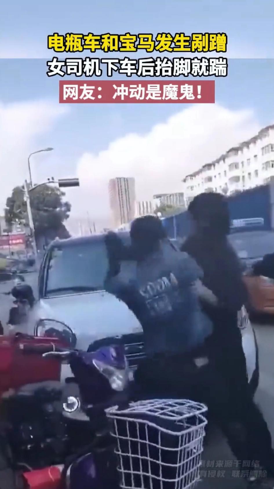 电瓶车和宝马发生剐蹭,女司机下车后抬脚就踹,这本来是小摩擦,好好协商解决就行。可