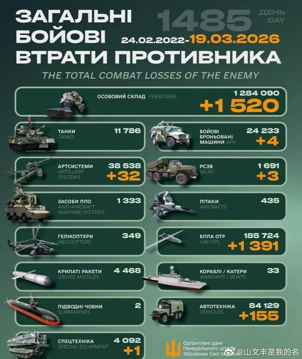 乌俄战争进入第1485天,乌克兰总参谋部发布战报:过去24小时乌俄双方交战193次,其中31次在胡利亚伊波列(31次在苏梅)、48次在康斯坦丁诺夫卡、8次在利曼、72次在波克罗夫斯克、3次在南顿涅茨克区域。毙伤俄1520名。俄军累计损失1284090人。摧毁俄4辆装甲车、32门火炮、3个火箭发射装置、1391架大型无人机、155辆军车、1件特种设备。
