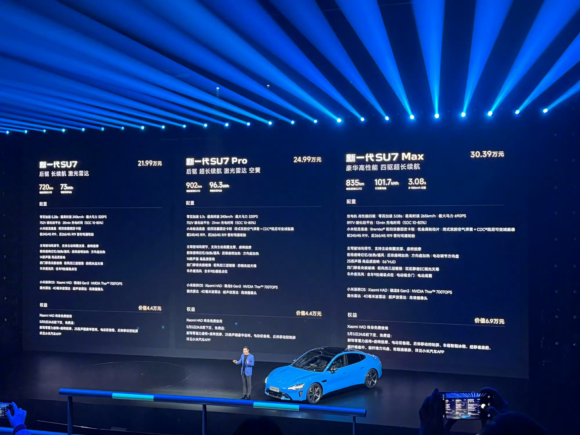 小米新一代SU7价格:标准版:21.99万,720km。Pro版:24.99万,