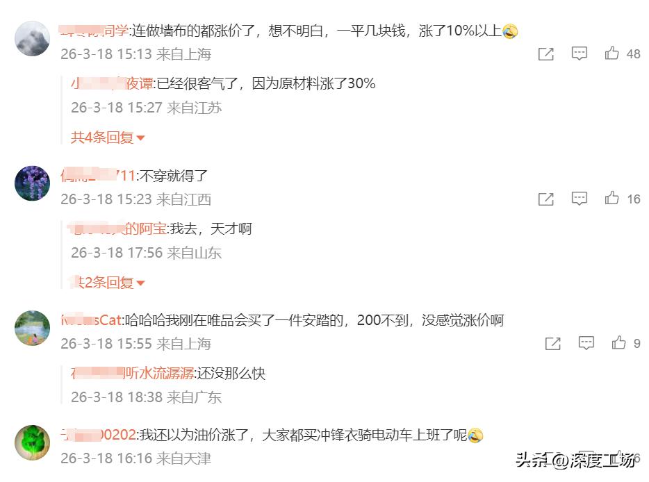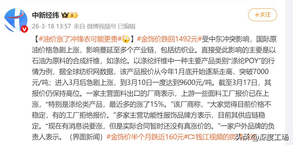 92号大涨1.6元!下午,和一位卖衣服的老板聊油价,他说油价涨了衣服可能也要涨价。 据最新消息,今年第五轮调价窗口定于3月23日24时正式开启,机构测算每升92号、95号汽油分别要涨价1.6元、1.69元,加满50升油将多花80元。在这位老板看来,这对燃油车主确实是不友好,但对新能源车主也不意味着好消息。 原油价格的急剧上涨,正波及以石油为原料的合成纤维,如涤纶。大家都知道,国内很多衣服都是涤纶做的,一些主营面料出口商表示,上游一些面料工厂报价已在上涨,多的涨幅高达15%。一些服装品牌则表示,有消息说要涨价,但合同还没到期,暂时没影响。朋友则认为,如果价格迟迟降不下去,后面就不好说了。 返程途中还问了对象,问她如果因为原油成本的原因让衣服涨价了怎么办,她的回答也挺有意思,一是买棉麻衣,二是去奥莱、唯品会这些折扣渠道买打折的大牌。对于一个几乎每月都要买衣服的人来说,她说出这样的话真不容易,但作为全家人的衣橱管家,又能看出她对“省钱过日子”的深刻理解。 从多方面来看,新一轮全球通胀正在到来,但普通人也在用精明对抗通胀。这不是抠门,是时代教会的生存智慧:越是花钱如流水,越要把每一分钱花在刀刃上。