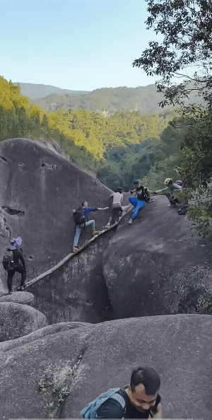 棍子上的女子:哇哇!哎哎哎!哎呀! 站在石头上男子:这声音好听! 穿着瑜伽裤来爬山,实话实说,一看就不是一般人……