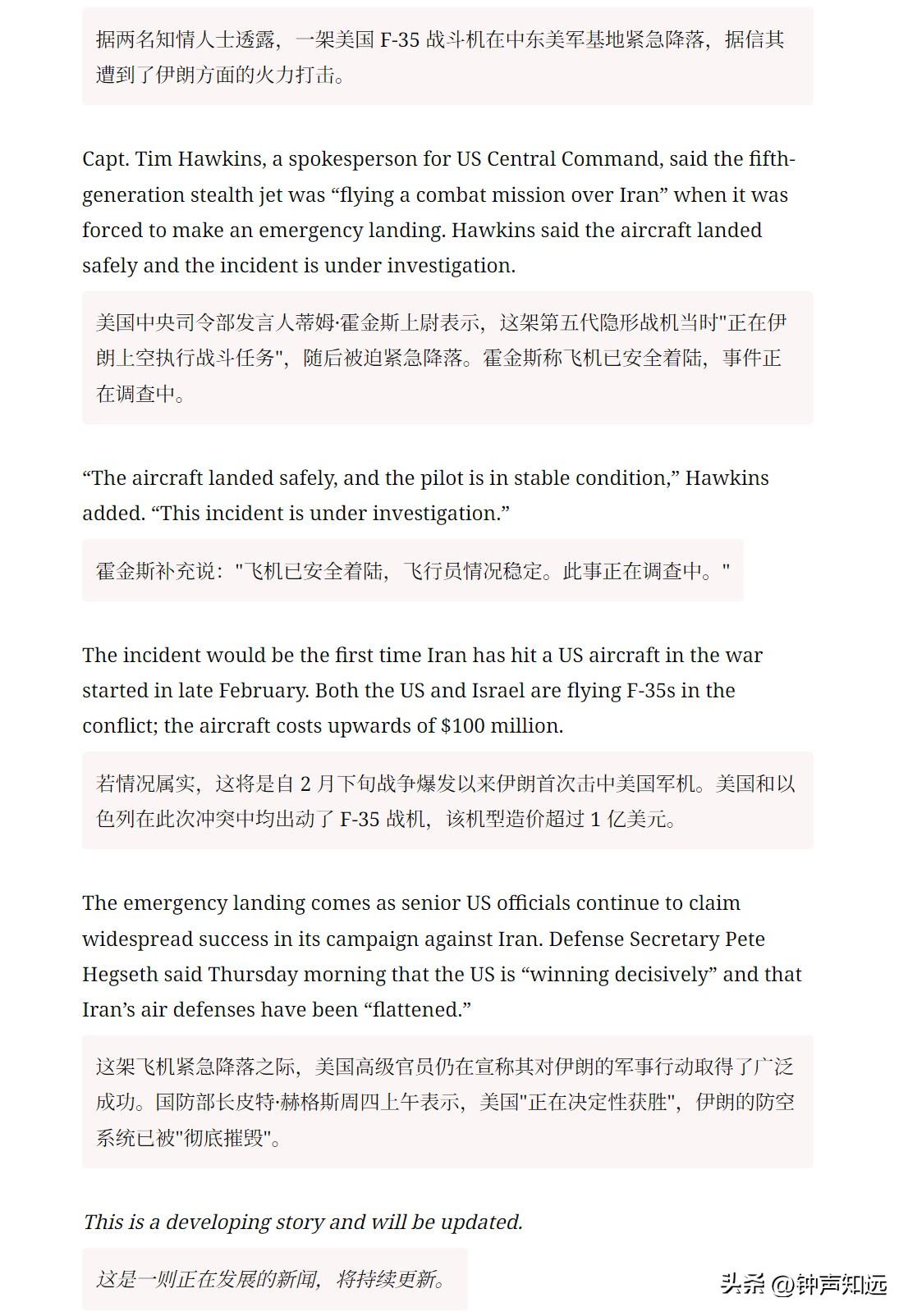 美国F-35战机被伊朗击中,伊朗防空怎么突然变强了?特朗普刚说消灭了伊朗100%的军事设施,这回尴尬了吧! 当地时间3月19日凌晨,美军一架执行任务的F-35A隐身战机在伊朗上空疑似被防空火力击中,最终紧急迫降在中东美军基地,战机严重受损,飞行员被特种兵接走。伊朗革命卫队随后高调宣布,本国新型防空系统在中部空域精准命中这架F-35,这也是本轮中东冲突以来,美军五代隐身战机首次确认被伊朗防空部队击中。 伊朗防空怎么突然变强了?果然只要你够硬、够强、坚持抗击,沙漠里就能长出新东西! 美国以色列战机在伊朗领空肆无忌惮轰炸的日子要过去了,美伊战争要开始下半场。 其实这也不是伊朗第一次宣称击落F35战机,2025年6月伊朗宣称击落2架以色列F-35I和1架美军F-35A,但美国以色列均予否认,而这次伊朗再次宣布用新型防空系统击中并严重损毁一架美军F-35A,美方仅表示正对此事展开调查,也就是默认了,这也是F-35服役以来首次在实战中被确认击伤。 不过F35也没有传说的那么牛,截至2026年3月20日,F-35战机公开的非战斗坠毁记录就有12起,包括A/B/C三个型号,都说是燃油管故障、发动机问题、航电失控、操作失误等训练或机械原因,涉及美国、英国、日本、韩国等国。 但此前实战层面暂无美方官方承认的被击落记录,伊朗这次是创造了一个记录,离伊朗收取霍尔木兹海峡过路费的日期不远了。