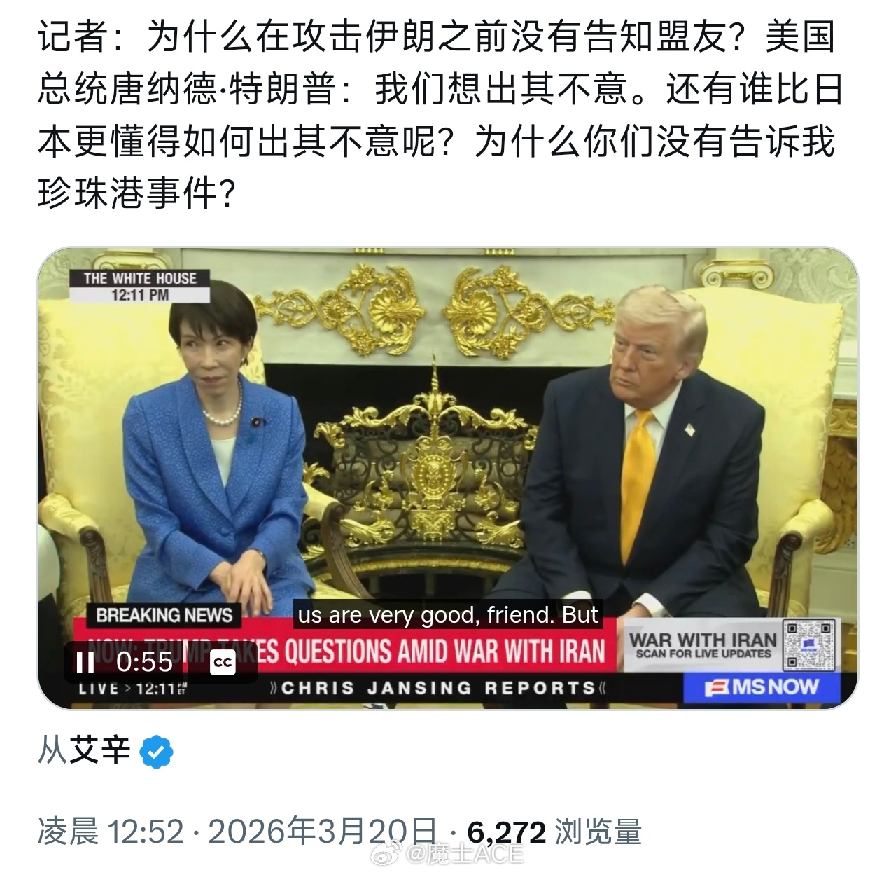 招笑!特朗普又整了个大活儿羞辱了日本!直接把高市早苗搞得失去了表情管理~日本记者问——你美进攻伊朗之前,怎么不和日本通个气儿?其实日本记者,就是想责怪你美挑起了中东大战,日本连一个提前屯油的内部消息都拿不到,搞得日本现在这么被动,还算是盟友吗?特朗普这次总算是好好学过了历史,直接零帧起手,反向羞辱——你们当年偷袭珍珠港,不也没有提前告知吗?一席话,高市早苗直接现场气短。老川子压根就没把日本当个正常国家。特朗普要求日本就伊朗战事出力特朗普见高市早苗提偷袭珍珠港烽火问鼎计划