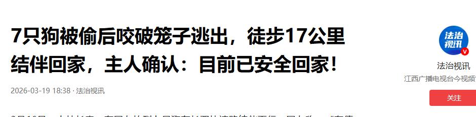 结伴走17公里回家的狗狗里,最让我感动的是那只柯基!它的名字叫大胖,在整个行程中,它几乎是一步一回头,关注着德牧的动向! 2026年3月16日,长春长双快速路上出现了让人目瞪口呆的一幕。七只狗狗紧紧贴着马路牙子,在嗖嗖飞过的车流里排成整齐的一纵队往前走。 它们可不是在散步,是刚刚从偷狗贼的货车里死里逃生,正拼了命地想找回家的路。这哪里是普通的狗狗走丢,这分明是一场震撼人心的集体大营救。 本来这些在村里撒欢的毛孩子,都被塞进了窄小的破铁笼,正要被拉往屠宰场。就在货车高速飞驰的时候,带头的那只德牧立了大功,它硬是用牙生生咬开了焊得不牢的笼子门。 德牧第一个跳下飞速行驶的车,用身体撞开了一道生路,剩下的六个小伙伴见状,也赶紧一个接一个地跟着跳了下去。 落地之后,它们谁也没乱跑。虽然德牧跳车时腿受了重伤,走起路来一瘸一拐,特别吃力,但这群狗狗展现出的凝聚力简直让人泪目。 几只没受伤的狗狗自发分散在两侧,把这位“断腿功臣”死死护在路中间。它们顶着刺耳的喇叭声和呼啸的大风,步调一致地往前挪。 队伍里那只叫“大胖”的柯基主动承担了保镖的工作。它每走几步就要停下回头瞅一眼,眼神始终锁定在受伤的伙伴身上。 靠着这种同生共死的劲头,整整17公里的逃亡路,这支队伍竟然一个都没少。它们就凭着对家里气味的那点模糊记忆,一点点挪回了原本属于它们的小村庄。 这次死里逃生,也撕开了非法盗犬黑产的遮羞布。在那些丧尽天良的罪犯眼里,这些有血有肉的生命只不过是按斤计价的“肉货”。 他们走高速跨区域卖狗,运输过程简直没人性。这七只狗狗能活下来纯属奇迹,更多被偷的宠物其实都消失在了黑暗的尽头。 好消息是,长春警方已经正式立案调查这件事了。这种偷狗卖狗的行为不光威胁治安,更是挑战法律和道德的底线,必须从根上把这根黑产链条给斩断。 同时也得提醒各位铲屎官,一定要看好自家的毛孩子,该牵绳牵绳,该打芯片打芯片,千万别给贼留机会。 截止到3月18日晚上,这群勇敢的小家伙终于全都回到了主人身边。它们带着满身的伤痕,硬是拼出了一个团圆的奇迹。 狗狗这种不顾一切的忠诚和灵性,真的太让人破防了。最后想说,一定要看好自家的宝贝,愿这种装满铁笼的货车永远消失在公路上。 信息来源:江西广播电视台,2026年3月19日。