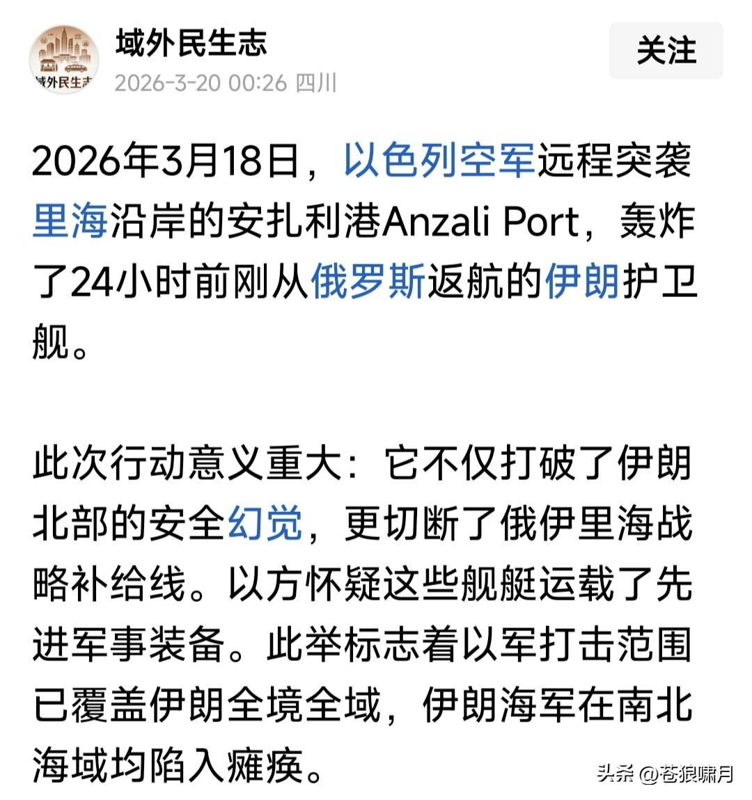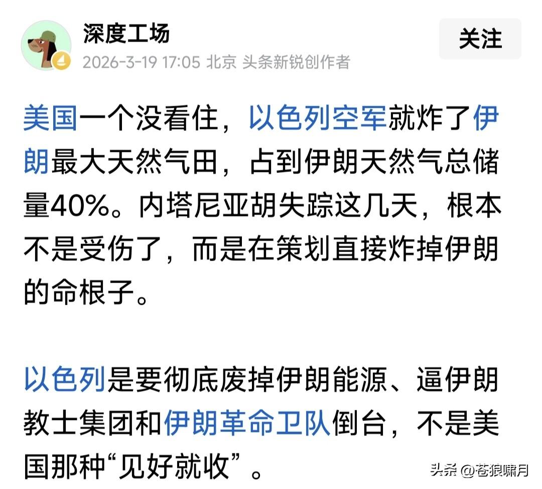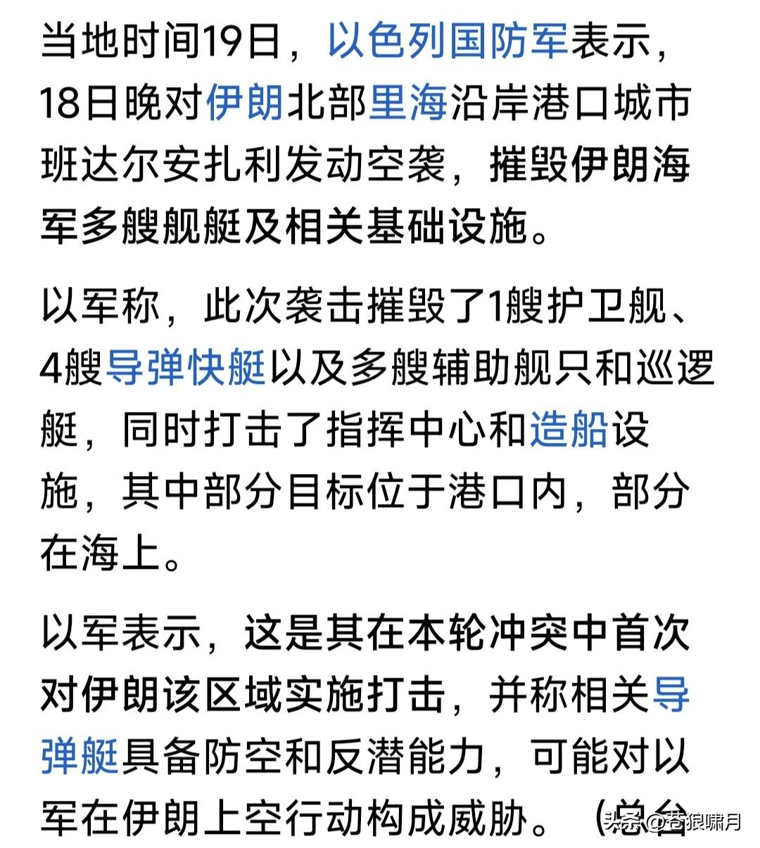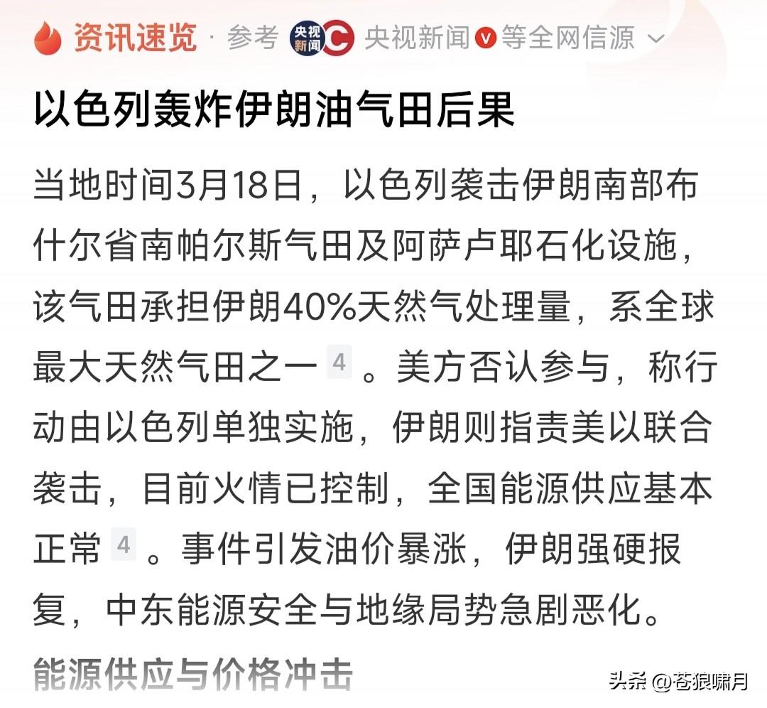 “中东小霸王”比“世界老大”更“狠”!美以伊冲突中,川普只炸伊朗军事设施与武器库,不炸石油设施与产运地,担心推高油价,增加生活成本。 尼亚胡似乎不考虑这些。他炸毁伊朗军政机构,斩首哈梅与一众高官,连续清除重量级人物。还攻击伊朗油田与石油外运港口,有点不顾一切啊! 这不,昨日就不顾川普劝阻,又轰炸伊朗南部帕尔斯气田,导致其天然气产量骤减40%!轰炸北部安扎利港,摧毁伊朗5艘舰艇,断绝北方海运! 内塔真是“狠角色”!为推翻伊朗“教士神权”,不顾一切不择手段,不达目的誓不罢休!什么目的?就是清除中东“反美以”源头,确保以安全? 刚看到一则消息。伊朗外长阿拉格齐发声:中国曾成功斡旋并缓和沙特与伊朗关系,现在也可以调解中东冲突,在调解美以伊冲突中,发挥作用! 实事求是说,战争无赢家,不管强与弱,都要受损失。但弱者的损失更大更重,和解是上策啊!但美以伊冲突不同其他,这件事有点不好管呐! …………