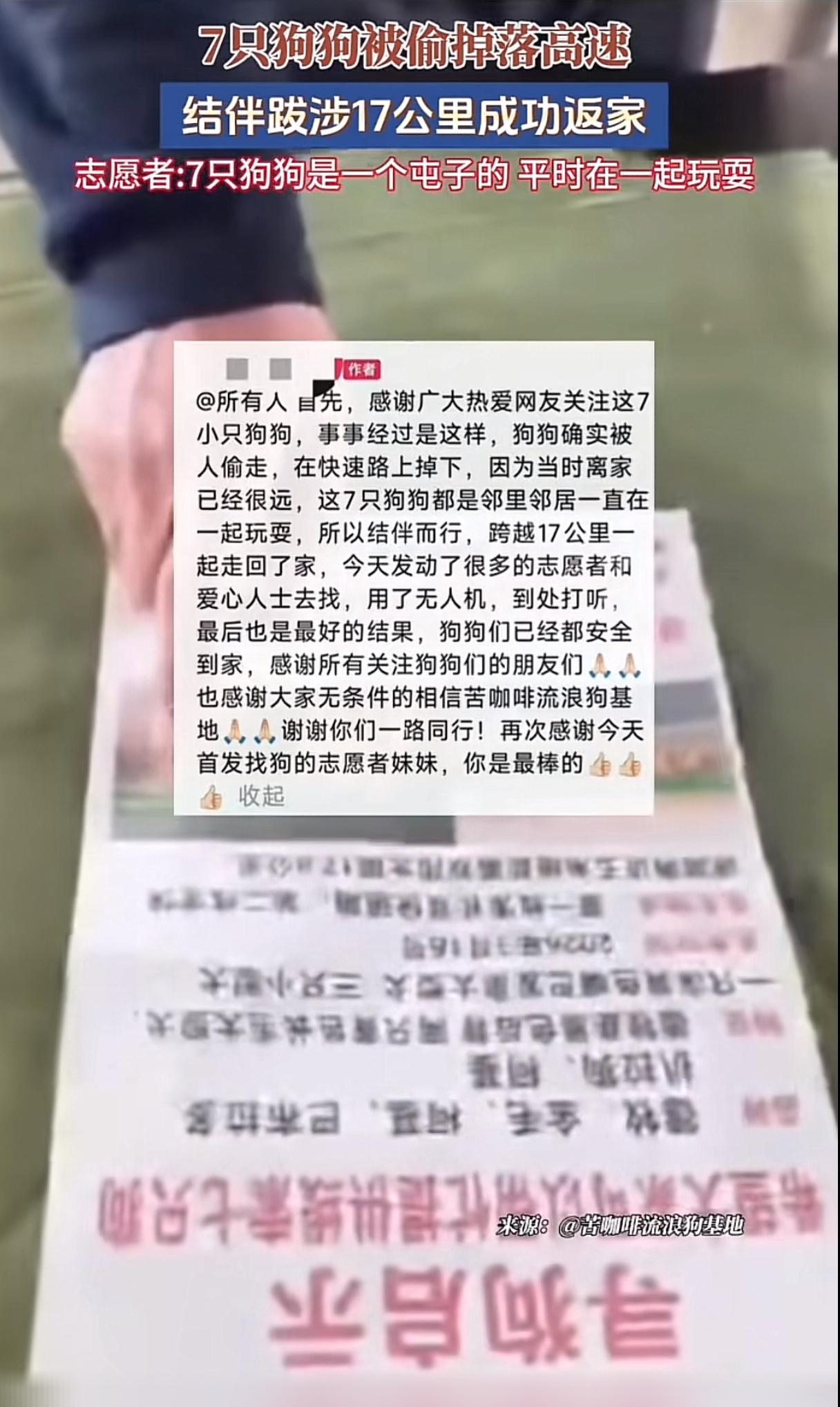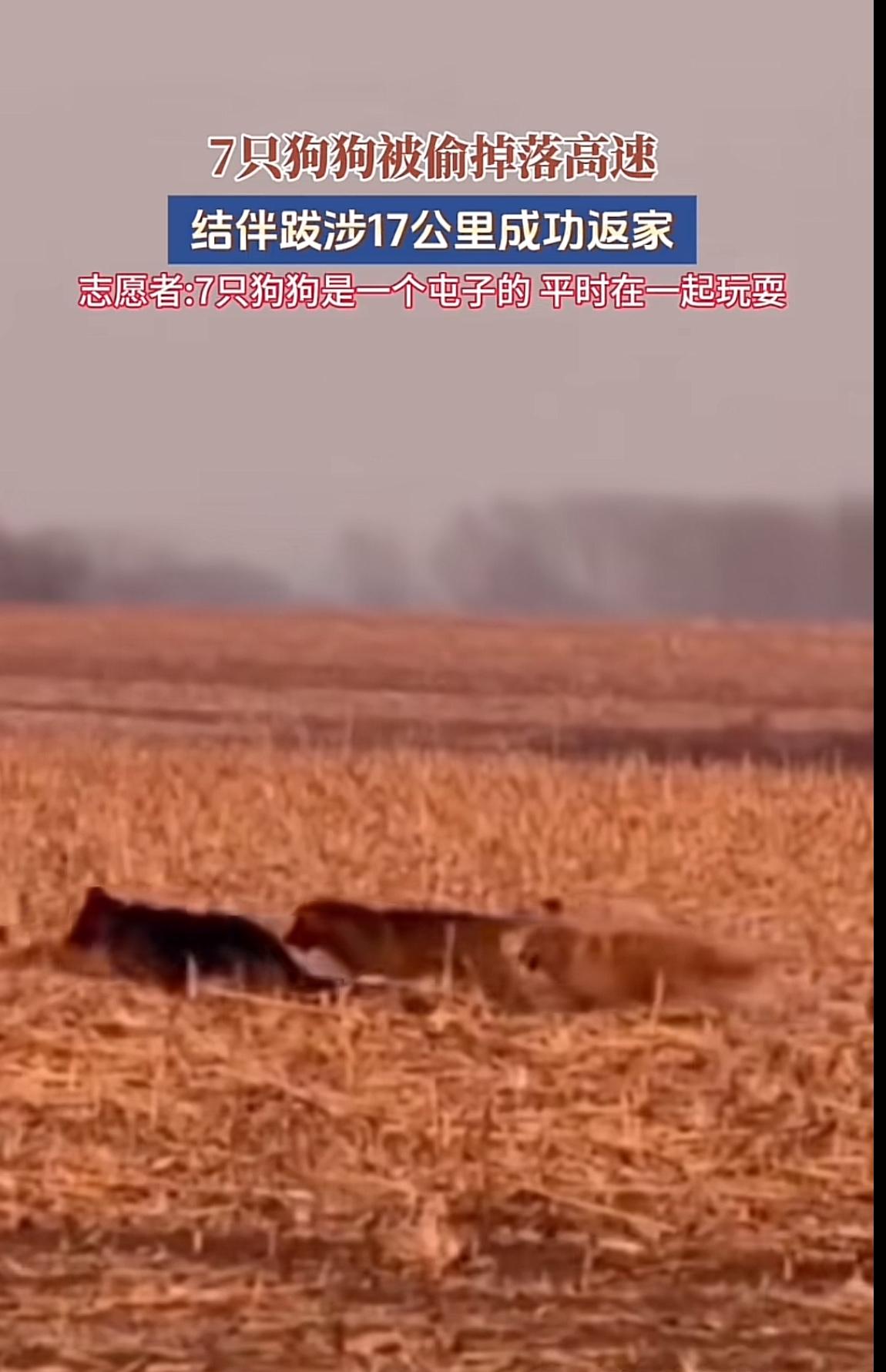 现实版狗狗流浪记太感人了吧!偷狗的偷了同一个屯子的7只狗狗,结果在高速路上狗狗掉下来了,当时离屯子已经17公里了,这几只狗狗就结伴而行,从陌生的地方跨越17公里互帮互助返回家乡。 这几只同一个屯子的狗狗们从小邻里邻居一起玩耍,大大小小种类不同的狗狗们面对突然的变故,也曾惊慌失措害怕,可还是互相帮助一个也不落下的一起穿越陌生的公路,穿越夕阳下的田野返回了自己的家乡。 屯子里的村民们发现狗狗丢了的时候还四处寻找,在大街小巷张贴了寻狗启示,发动了志愿者和无人机四处寻找,最终狗狗们安全回家。 这真是现实版的汪汪队出动,狗狗们太励志了。