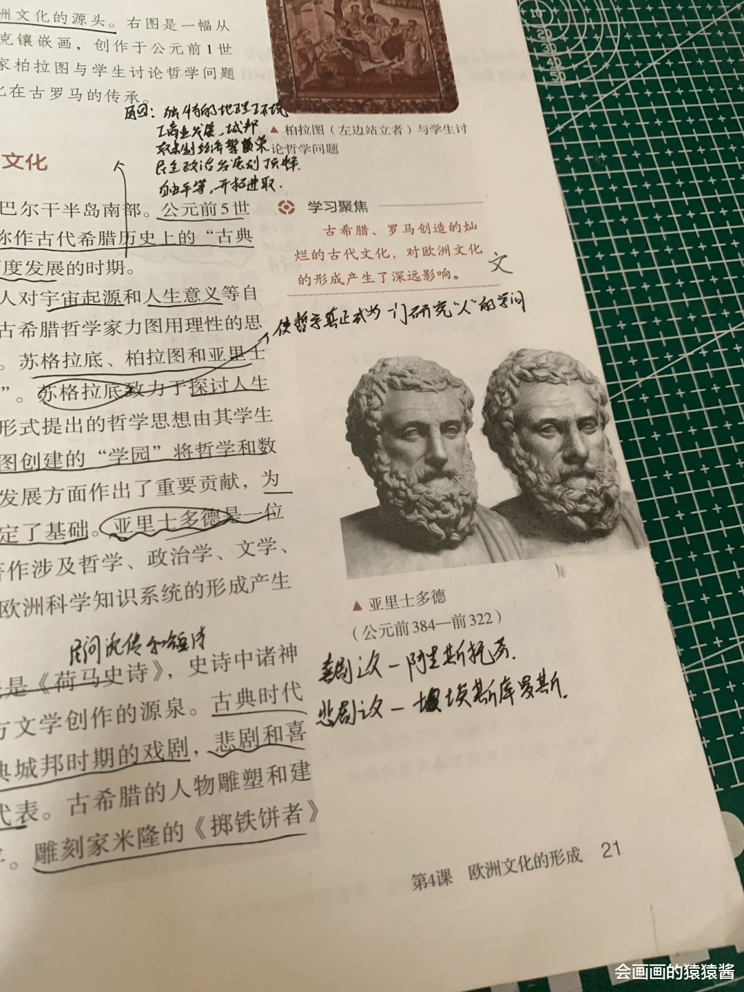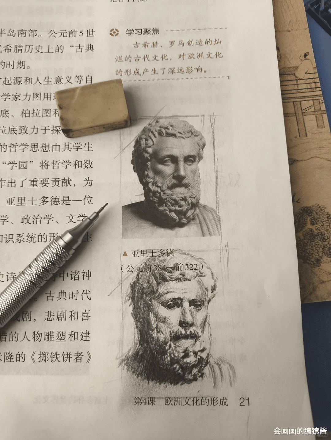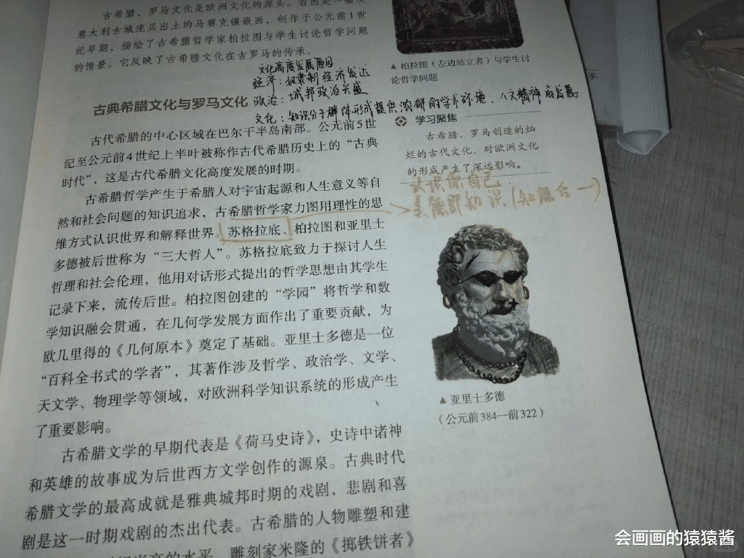 除了课本,练习册、笔记本,甚至试卷的空白处,都是我们的创作小天地。画累了素描静物,就随手在课本角落画个简约小头像;背烦了美术理论,就给历史人物画个Q版小像;有时候和同学比拼绘画速度与手感,一节课下来,课本里便藏满了我们的小心思与小欢喜。