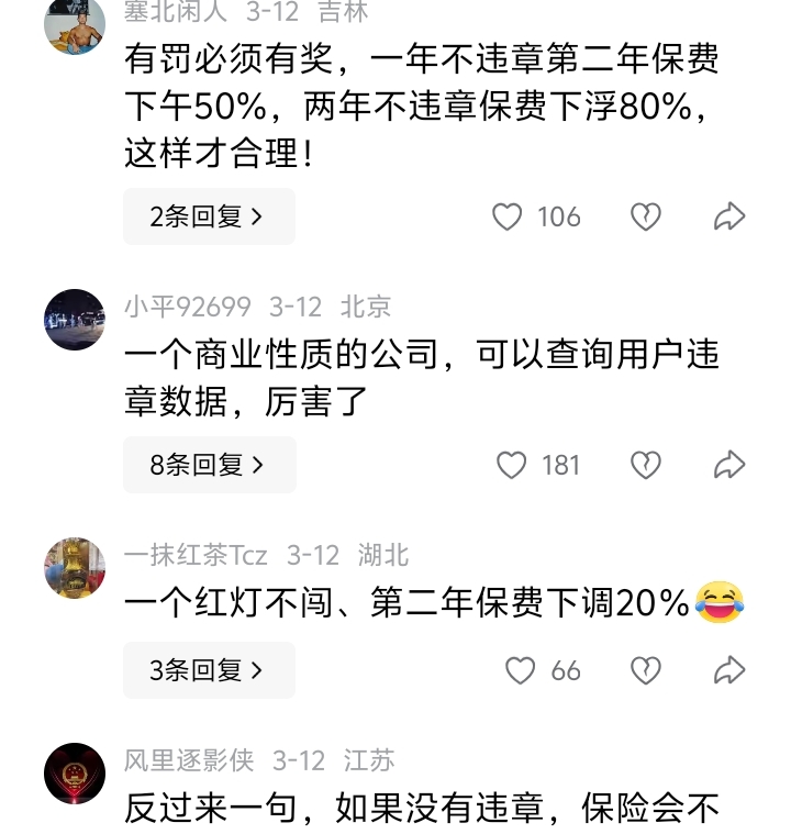 网友们纷纷表示,有罚就该有奖,一年不违章的是不是保费应该下调呢?
