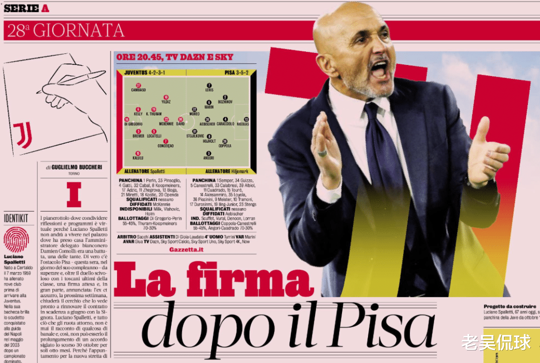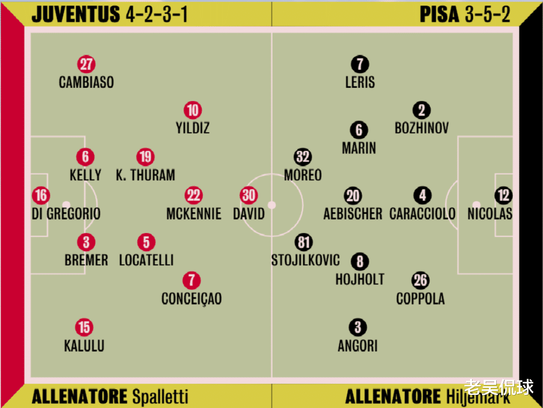 比萨保级压力巨大,希耶马克接手后,首秀战平垫底的维罗纳,随后连败三场,先后对阵AC米兰、佛罗伦萨和博洛尼亚,都是1球小负,距离保级线9分之差,若不能连续拿分,离意乙就越来越近了。尽管比萨防守尚可,但本场后防核心卡巴雷塞因伤只能硬撑先坐替补席,而他缺席的比赛,比萨基本都输了。主力门将伤愈,但仍不适合首发,二号门将斯库菲特继续养伤,今晚仍是三号门将尼古拉斯首发,能力还是比较有限。尤文回到主场,攻击力还是有的,今晚当能轻松过关。
