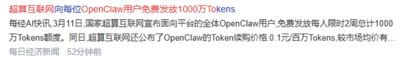 3月11日盘后,国家超算互联网宣布面向平台的全体OpenClaw用户,免费发放每人限时2周总计1000万Tokens额度。同日,超算互联网还公布了OpenClaw的Token续购价格:0.1元/百万Tokens,较市场均价有一定降幅。