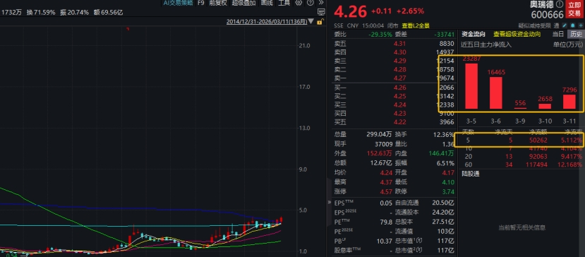 第五,低价+低位+主力抢筹,爆发性强。公司股价仅4元出头,位置处于底部区域,较历史高点跌去84%,市值100左右,关键主力资金连续5天抢筹超5亿元,占市值的2%。