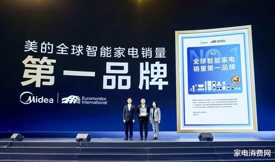 欧睿中国区总经理穆愔为美的颁发2025年全球智能家电销量第一证书,中国家电研究院副院长曲宗峰现场见证。