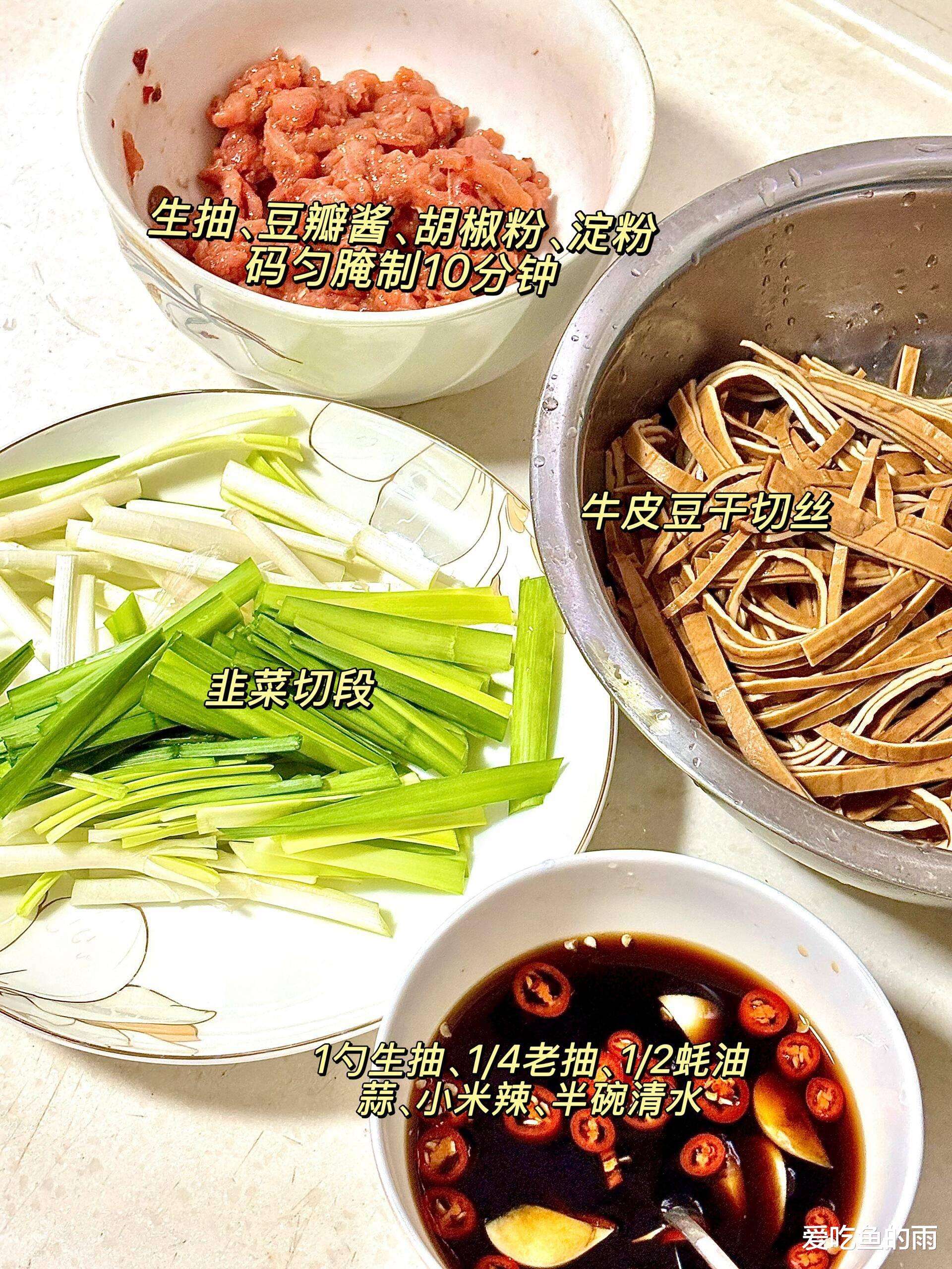 处理牛皮豆干,第一步是唤醒它的“灵魂”。切片不宜太薄,半厘米厚刚刚好,保留那份嚼劲。关键来了:务必用热水焯烫一两分钟!这能让它放松紧绷的身躯,变得更加柔韧,好吸收后续的滋味。捞出沥干,耐心等它吸饱的热气慢慢散尽,直到表面干爽。肉丝要嫩,全看前戏。猪里脊或后腿肉,顺着纹理切成细条(别逆着切,否则炒出来容易散碎)。腌肉是灵魂步骤:一点盐、一勺生抽、半勺料酒,再来一小勺淀粉和几滴油。用手温柔地“按摩”抓匀,直到肉丝变得黏糊糊的,裹上一层薄薄的浆衣。这层浆衣就是肉丝在滚烫油锅里冲锋陷阵的“金钟罩”,锁住水分,保证出锅时嫩滑不柴。