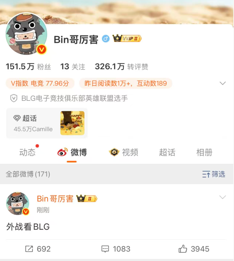赛后上单Bin还是照旧第一时间更新微博,打出了六个字:外战看BLG,大家其实也早已习惯了他这种处事方式,也已经见怪不怪,但是这一次细品一下,好像BLG这一场惊险的胜利,真的具有非凡的意义,因为LPL赛区已经很久很久没有在BO5赢下LCK了!LPL上一次在国际赛当中赢下LCK,还要追溯在515天前,是S14全球总决赛半决赛BLG对阵HLE,当时他们以3-1淘汰了HLE,那年BLG的队员就是现在的上单Bin、打野Xun、中单Knight、辅助On,只是时过境迁,当时HLE的下路选手Viper,转身一变成为了BLG的下路,也成为我们抗击LCK的一份子!正所谓久旱逢甘霖,我们终于再次在国际赛战胜LCK的BO5,虽然惊险虽然打的是BFX,但路总是要一点点走出来的!