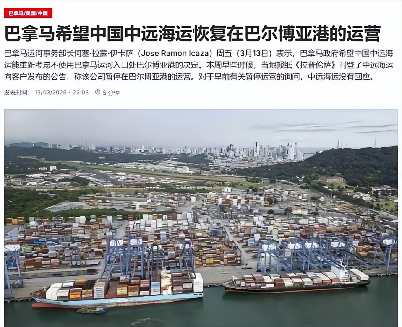 3月10日,中远海运直接出手,宣布立即暂停巴尔博亚港所有船舶进出港作业,取消全部订舱,清空并转运所有空箱。