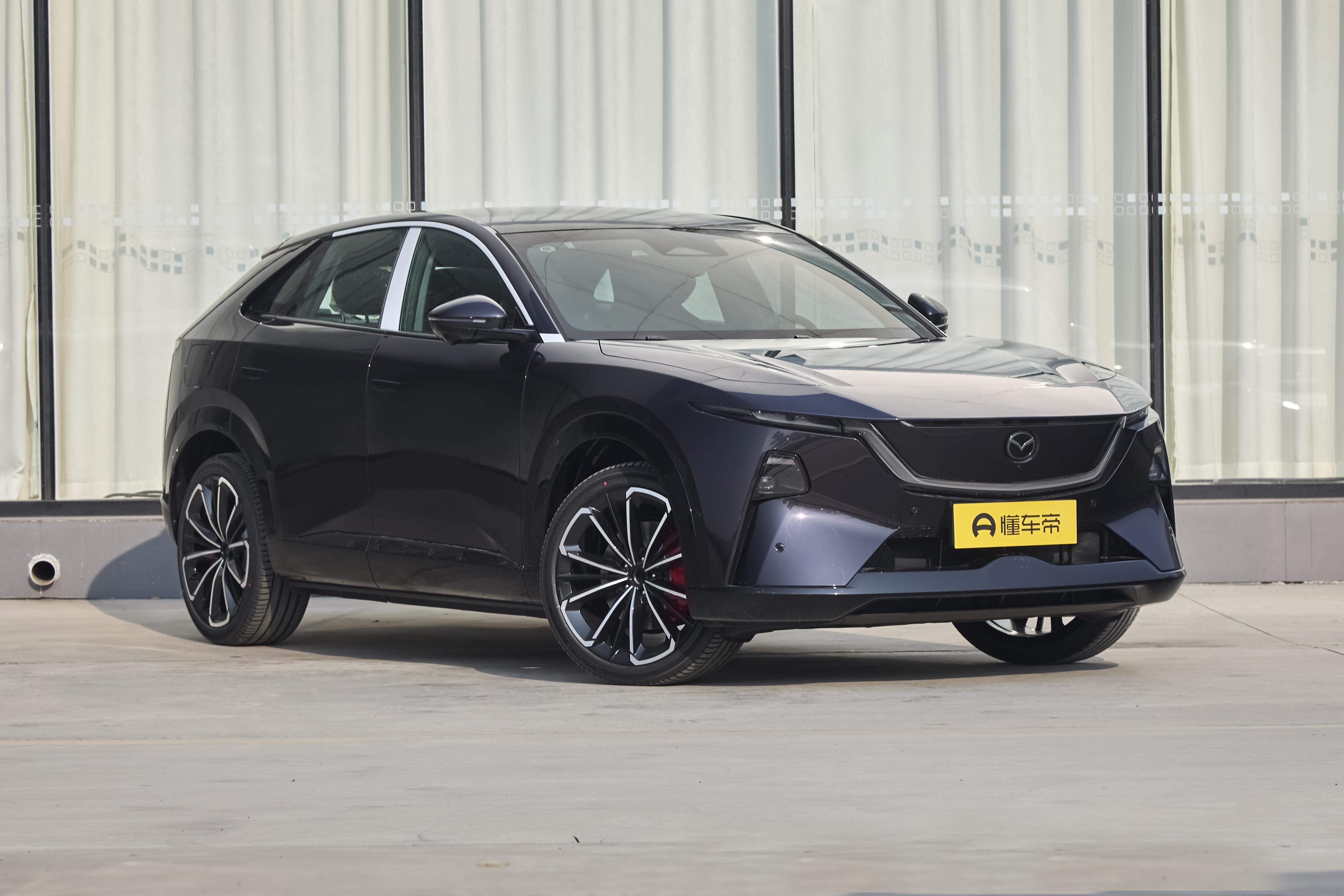 初次见到EZ‑60的时候,我确实被它整体的姿态给吸引住了。它没有走现在很多车型那种棱角特别分明的机甲风格,而是继续沿用了马自达经典的魂动设计语言,整体都是用很流畅的曲面和优雅的线条来塑造车身。前脸用的是封闭式格栅,纤细的贯穿式LED日行灯和分体式大灯组搭配得很自然,中间可发光的车标在晚上点亮之后,辨识度非常高。这样的设计,让整个车头看起来既简洁,又带着很明显的未来感。车身侧面是标准的溜背造型,线条从车头一直很顺滑地延伸到车尾,再加上隐藏式门把手和无框车门的设计,整车的一体感很强。