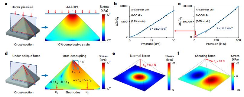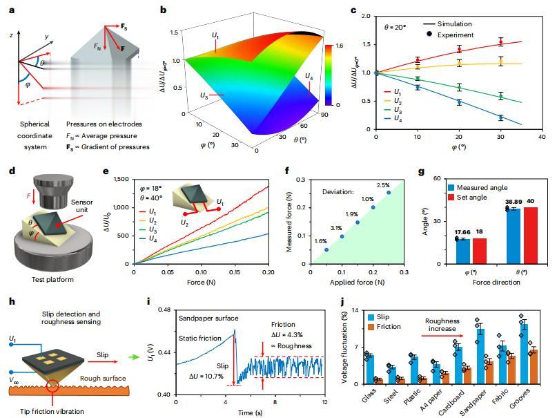 背后的原理并不复杂,金字塔型的结构在受力的时候,底部的四个电极会输出不同的电压信号。垂直下压的时候,四个电极的电压变化是一样的;斜着推的时候,力指向的一侧电极电压更大。通过计算四个电极的电压差值,就能反推出来力的方向、角度和大小。研究人员使用有限元模拟验证了这个模型,实际测试中力测量偏差小于 5.3%,角度偏差小于两度。