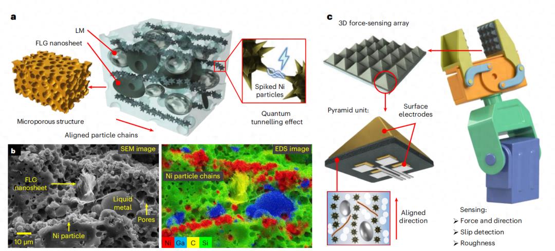 镍颗粒在磁场作用下排列成为一条条链子,石墨烯像桥一样把这些链条连接起来,液态金属则充当可以变形的节点。整个材料被打造成微米级的小孔结构,最后被做成由边长 200 微米的小金字塔组成的阵列,每个金字塔就是一个独立的传感单元。
