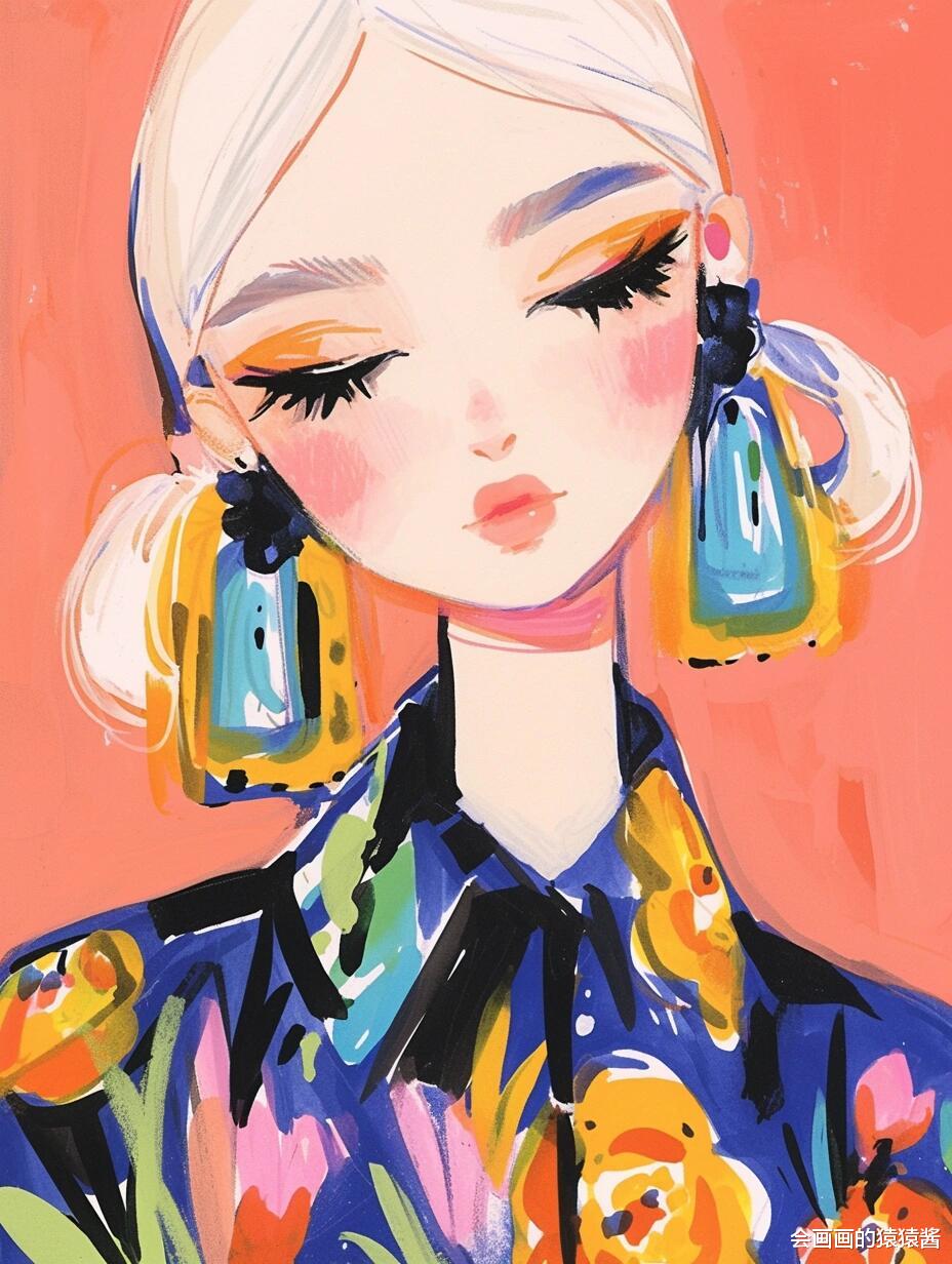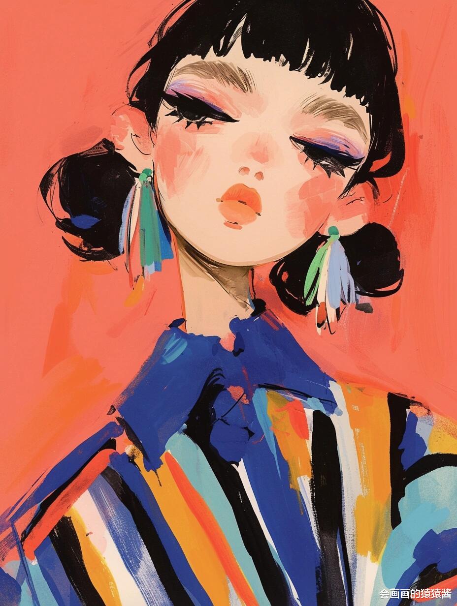 用 ComfyUI 解锁高饱和撞色时尚插画,跳出千篇一律的温柔画风,用浓烈色彩打造视觉记忆点。画面里的金发少女托腮慵懒倚靠,粗粝笔刷把蓝黑西装、橙红条纹内搭揉成撞色块面,夸张的黑白耳饰与粉橘腮红形成俏皮呼应,暖橙背景把情绪拉满,像把都市女孩的鲜活与张扬直接泼在画布上。
