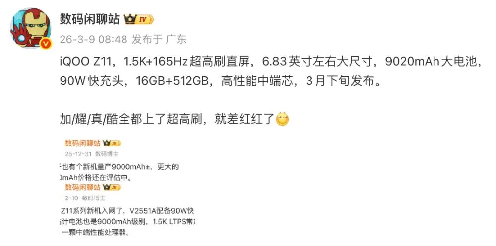 据悉,iQOO Z11将配备1.5K+165Hz超高刷直屏,6.83英寸左右大尺寸,内置9020mAh大电池,90W快充头,提供16GB+512GB存储组合,搭载高性能中端芯,3月下旬发布。