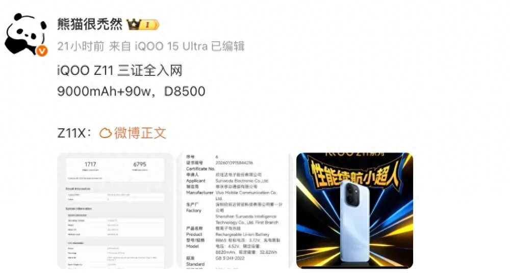 据悉,博主@熊猫很禿然 的一份消息显示,iQOO Z11 三证全入网,内置9000mAh电池,支持90W快充,核心搭载天玑 8500 芯片。