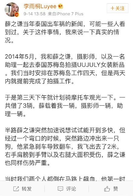 2017年9月15日,薛之谦发布长文,承认与李雨桐的关系,但否认骗钱等指控。