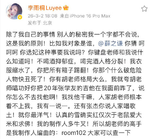 2026年3月2日,李雨桐在微博连发几十条,实名举报薛之谦:重婚、害她流产、长期霸凌、导致她抑郁12年。关键一句:她顺带爆了一句——“薛之谦私下说张杰唱歌土!”同时把2017年《吐槽大会》薛之谦那段话翻出来。虽然,她发完没多久就删了,说只是开玩笑,但截图已经传遍全网。