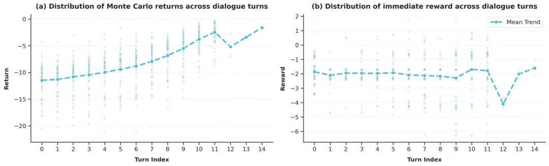 团队进一步观察到,即时奖励的分布与对话轮次相对解耦,而未来回报的分布则往往与轮次强相关。因此,MAPO 分别对二者进行基于 batch 与基于 turn 的归一化,再通过 convex combination 进行融合,从而在保留 critic-free 优势的同时,更稳定地优化长序列对话策略。