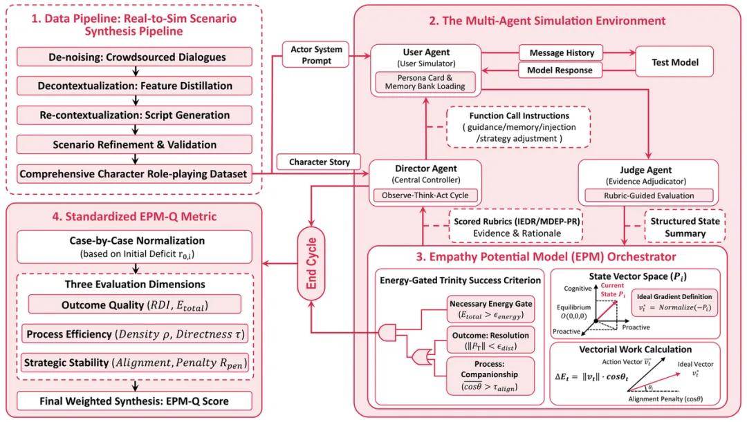 为此,研究者构建了一套完整评估框架:首先通过 Real-to-Sim 数据管线,将真实但嘈杂的长对话蒸馏为可复现的心理场景;随后,在一个非脚本化的多智能体沙盒环境中,让用户 agent、导演 agent、裁判 agent 与被测模型展开开放式互动;最后,通过 Empathy Potential Model(EPM) 在潜在心理空间中建模用户状态变化,从而在轨迹层面评估对话是否产生持续、稳定的正向影响。
