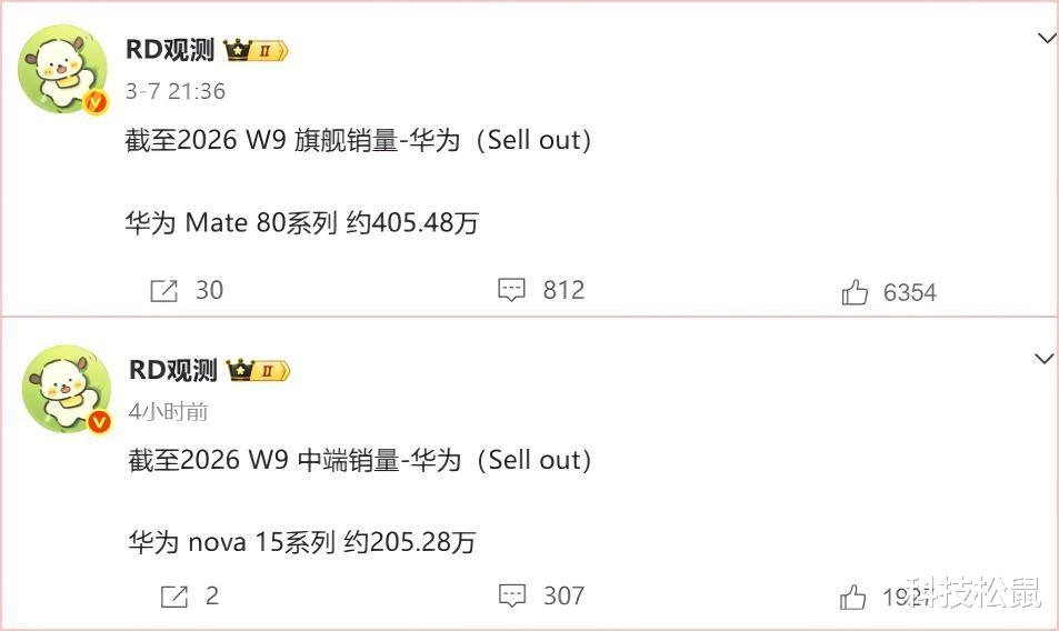 截至2026年W9,Mate80系列总销量突破400万,达到了405.48万,稳居国产旗舰销量第一的宝座,并进一步扩大了对小米17系列的优势。中端的nova15系列虽然总销量不及Mate80系列,但在中端手机中也表现抢眼,截至W9总销量成功突破200万台,达到了205.28万台。