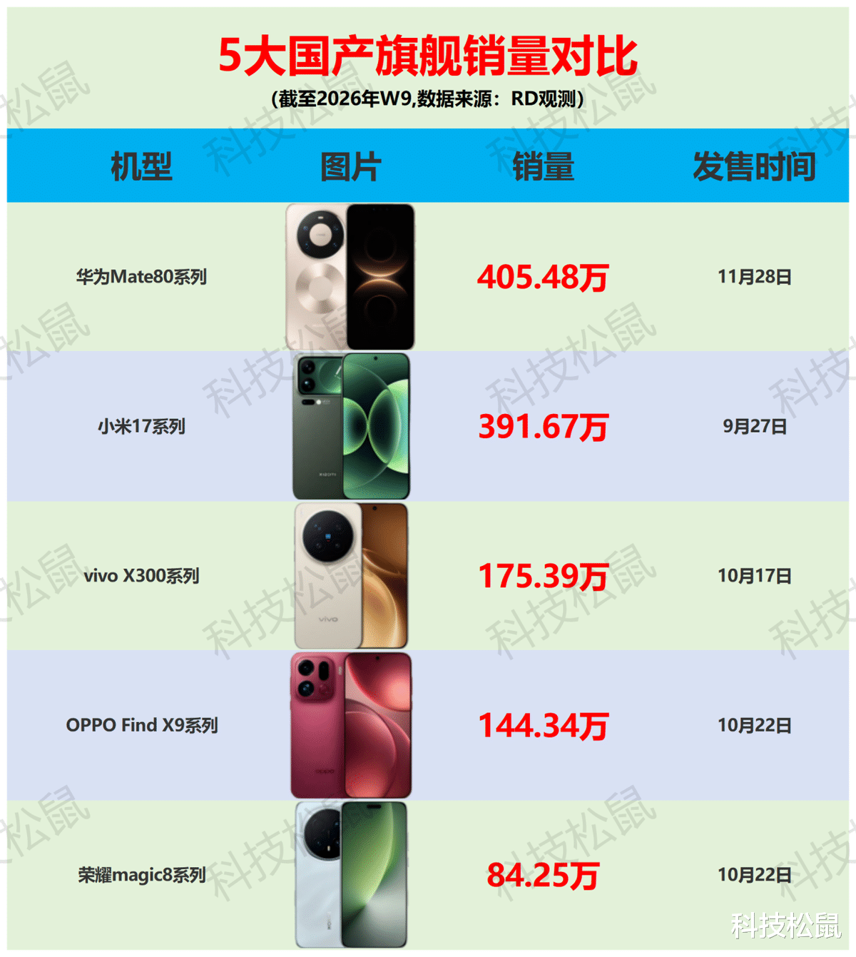 华为Mate80系列11月28日正式开卖,截至2026年W9,上市仅3个月多一点,销量成功突破400万大关,平均月销量130万以上,平均周销量30万以上。华为Mate80系列在5大国产旗舰中是上市最晚的,但凭借更强的产品竞争力,总销量后来居上,上市1个月左右就超越了荣耀Magic8系列、OPPO Find X9系列和vivo X300系列,2026年W8成功超越早上市2个月的小米17系列,登顶国产旗舰销量第一。