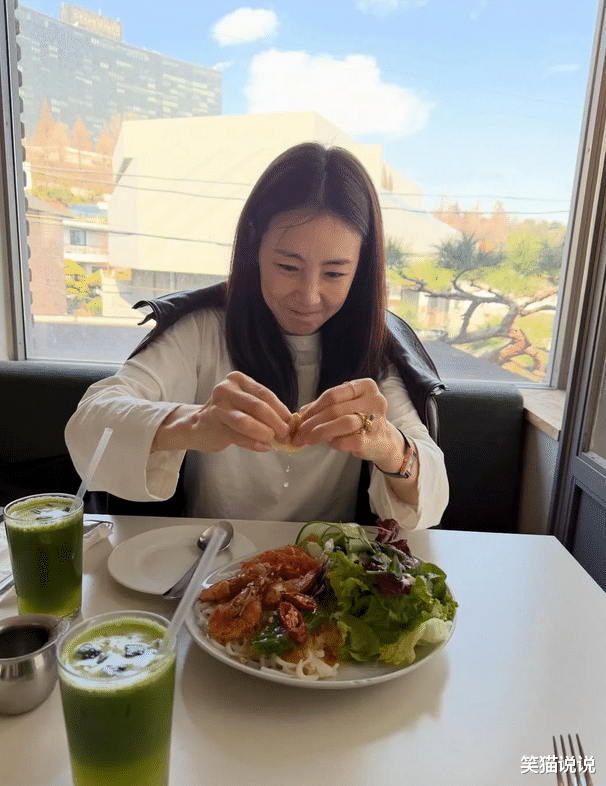 崔智友这一次外出是跟朋友一起聚餐,她的朋友也为她拍下了她用餐时的照片。从她挑选食物,到她对着自己的沙拉菜挤柠檬汁的照片。从她背后的外景可以看出,天气很不错,蓝天白云,阳光灿烂,这天气确实很适合跟朋友一起外出游玩。