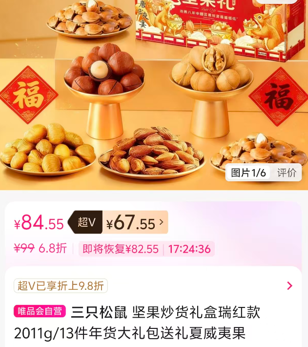 当然最戳人的还是性价比这一块,说实话直接让人对唯品会有了更大的好感。过年期间坚果礼盒这种硬货也直接打折,买得三只松鼠坚果礼包,2011克才67元,唯品会打6.8折卖。