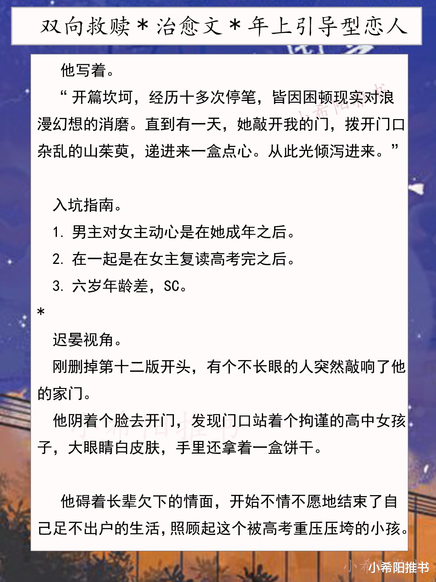 这本小说属于双向救赎文,彼此的心灵得到救赎,治愈系文真的很推荐。女主高考失势力,多年陷入父母畸形教育痛苦中,男主家境变故、陷入创作瓶颈,前期是男主用温柔和理智把女主从自卑和自毁的倾向中拉出来,后期则是成长起来的女主用她的方式治愈了男主多年的执念和伤痛 。 双向奔赴的两人,迎来了属于自己的曙光。