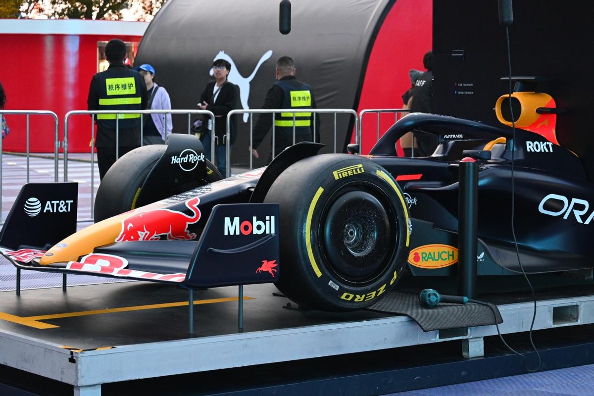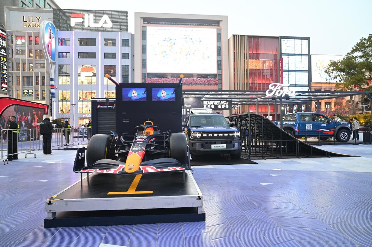 南京东路世纪广场的福特 × 红牛快闪店绝对是一个必须打卡的点,它直接把F1维修区搬进市中心,刘亦菲也体验过的1:1赛车换胎模拟器。你可以拿起启动扳手,亲身体验冠军车队几秒完成换胎的极致高效,瞬间化身红牛车队“编外技师”。