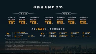 3月18日,极狐汽车宣布全新阿尔法S5正式上市。新车共推出7款版型,包含纯电、增程两种动力形式,补贴后售价9.98万元-16.88万元。据悉,除了可限时享受5000元购置税补贴,用户购买全新阿尔法S5还可限时获赠价值5000元的特殊外观色、价值4999元充电桩抵扣券等尊享礼遇。