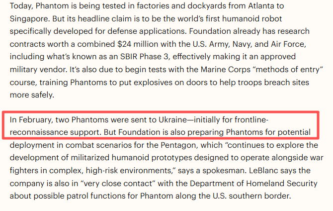 据悉,Foundation已与美国陆军、空军和海军签订了总价值2400万美元的研究合同,并成为获批的军事供应商。公司还与美国国土安全部保持“密切接触”,讨论Phantom在美国南部边境的巡逻任务。