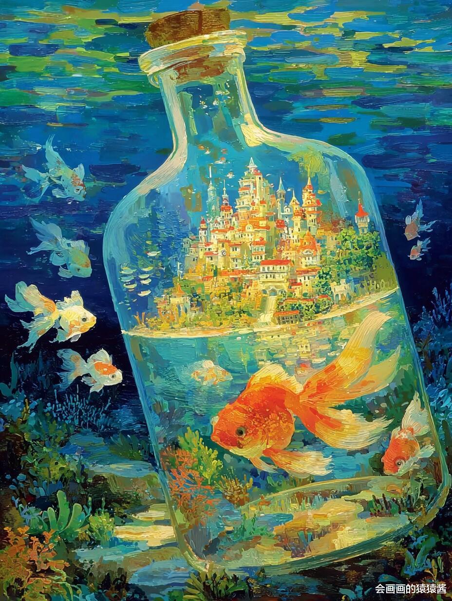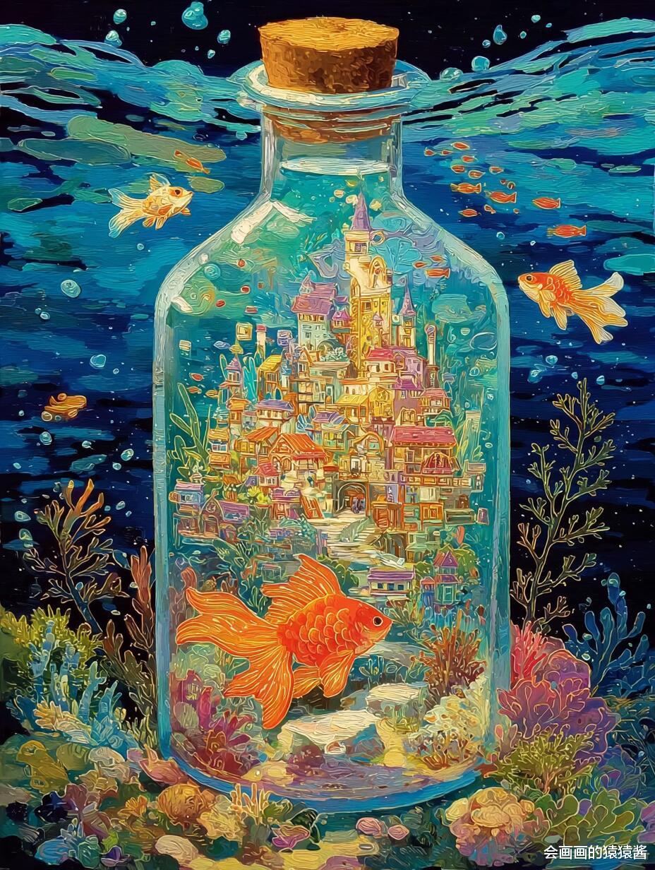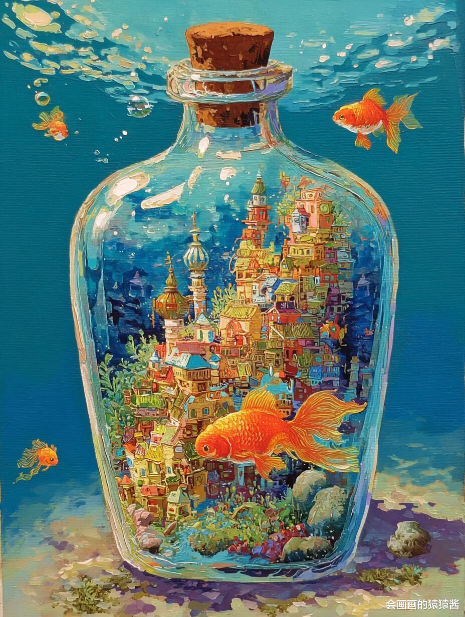 生成时,我用 “厚涂笔刷强化” 节点锁定油画质感,让每一笔都带着堆叠的肌理;再通过 “空间分层” 节点,把瓶内城堡、瓶外深海、游动金鱼的层次彻底拉开,让微观世界的精致感和深海的辽阔感形成强烈反差,既独特又有记忆点,完全不会和同类内容撞风格。