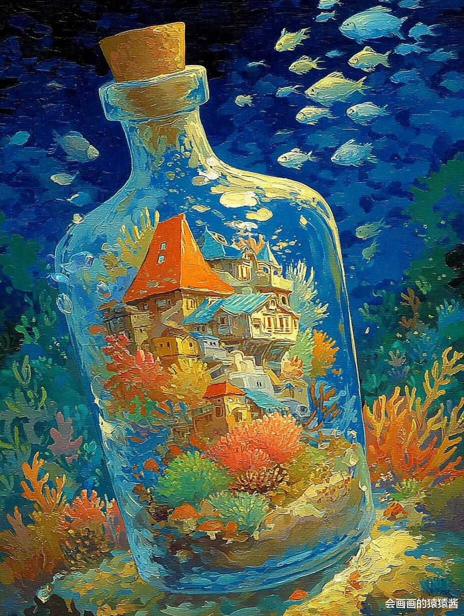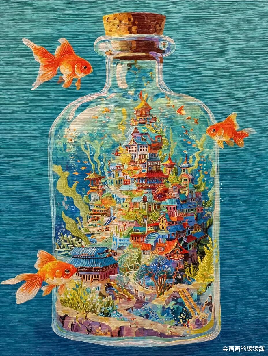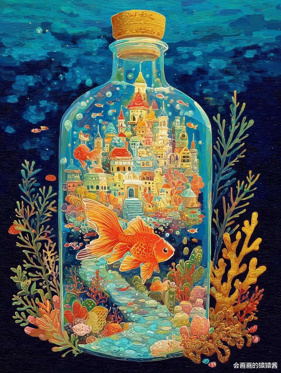 生成时,我用 “厚涂笔刷强化” 节点锁定油画质感,让每一笔都带着堆叠的肌理;再通过 “空间分层” 节点,把瓶内城堡、瓶外深海、游动金鱼的层次彻底拉开,让微观世界的精致感和深海的辽阔感形成强烈反差,既独特又有记忆点,完全不会和同类内容撞风格。