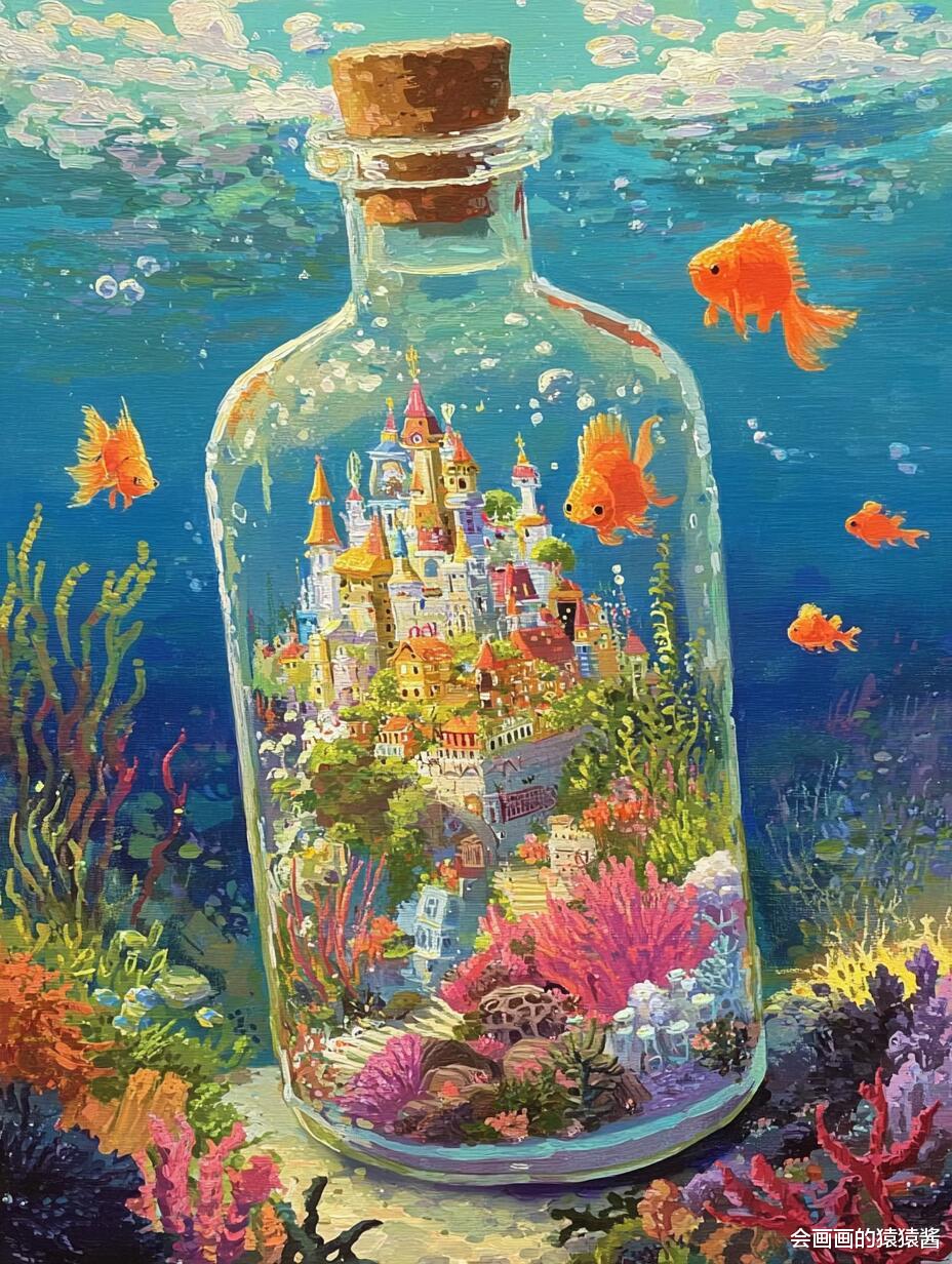 ComfyUI 提示词(瓶中城堡奇幻油画风)竖版构图,奇幻厚涂油画,深海里漂浮的玻璃瓶,瓶内藏着暖金色童话城堡,瓶内外穿梭的金鱼,斑斓珊瑚与波纹海水,厚重油画肌理,高饱和蓝绿与暖金撞色,微观世界纵深感,高清 8K,童话油画风格,治愈奇幻氛围。
