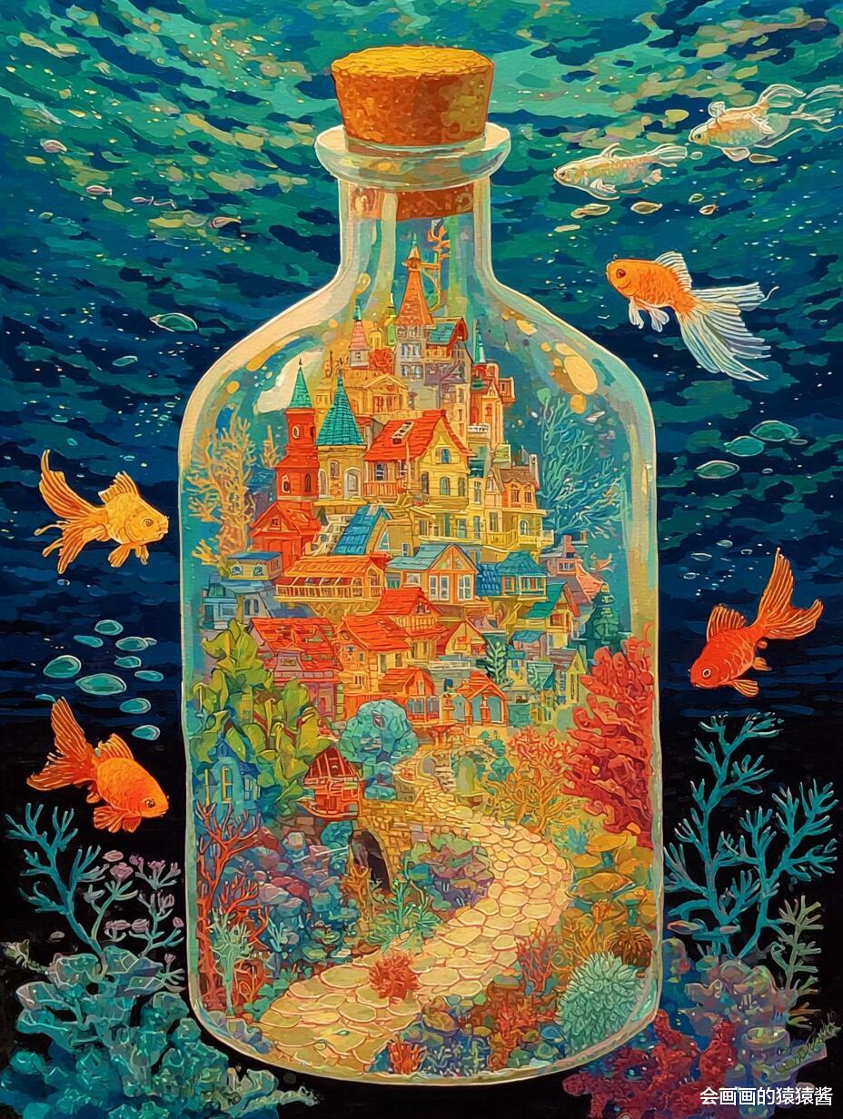 这张瓶中城堡插画,是用 ComfyUI 把 “微观童话感” 拉到极致的一次尝试。深海里漂浮的玻璃瓶里,藏着一座暖金色的童话城堡,金鱼在瓶内外穿梭,厚涂颜料的肌理让海水的波纹、珊瑚的纹理都带着触手可及的颗粒感,像把一整个奇幻世界都封存进了透明容器里。