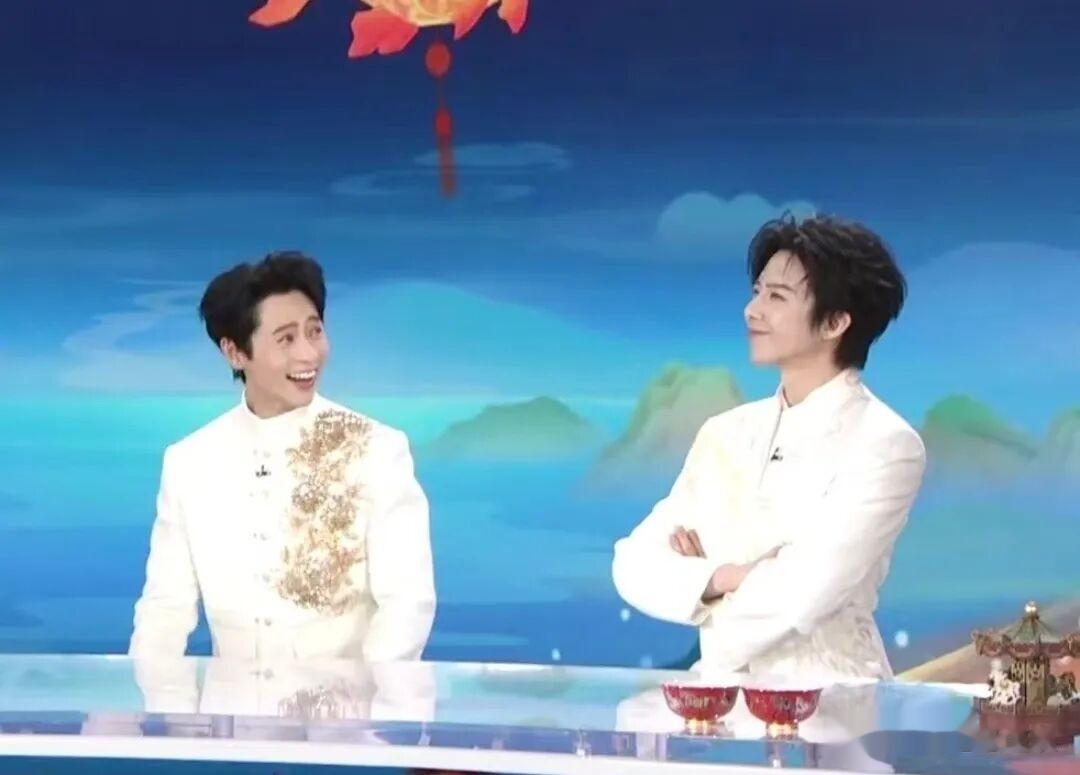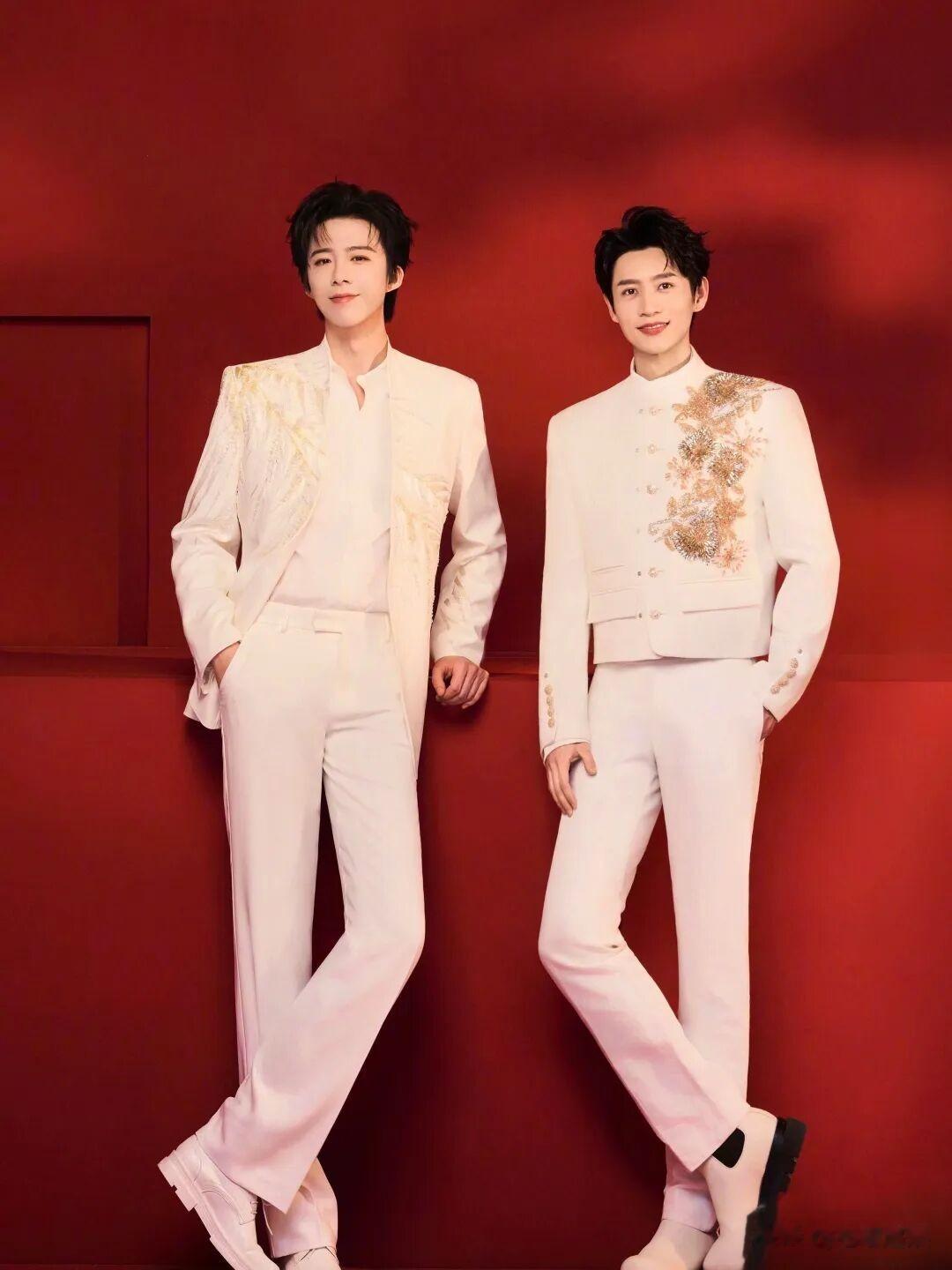 实诚人都喜欢褒贬自己,明明两位身穿白、金中式礼服,高大挺拔,儒雅飘逸,完全是秒杀众人的帅哥。