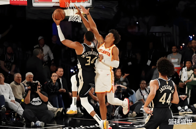 字母哥外线持球,冲击步行者内线,两人对抗之后,字母哥转身加速挤进禁区,随后就是一记隔扣。