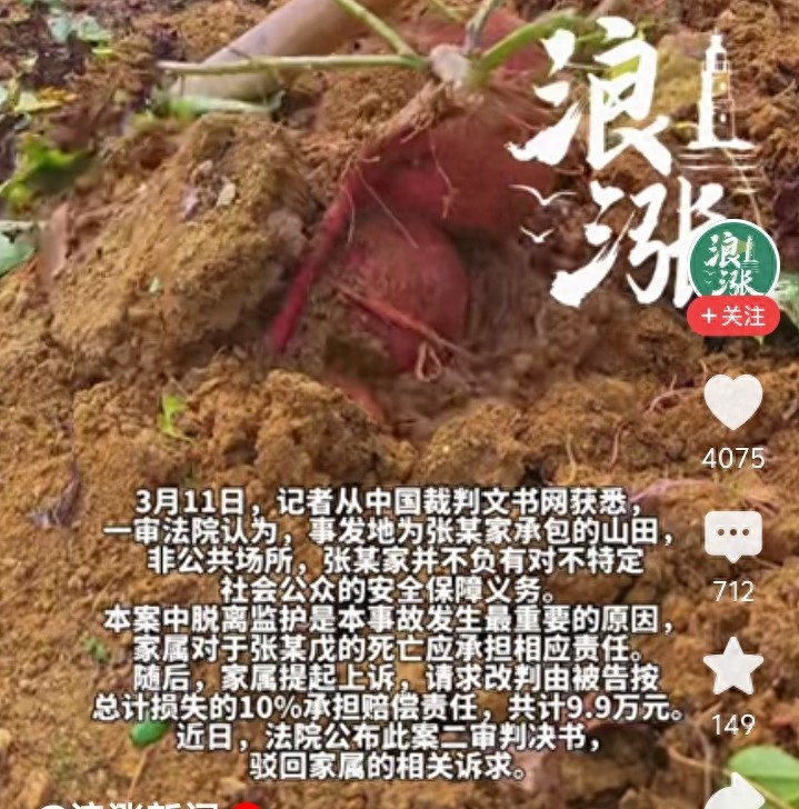 一审法院认为,事发地为张某家承包的山田,非公共场所,张某家并不负有对不特定社会公众的安全保障义务。