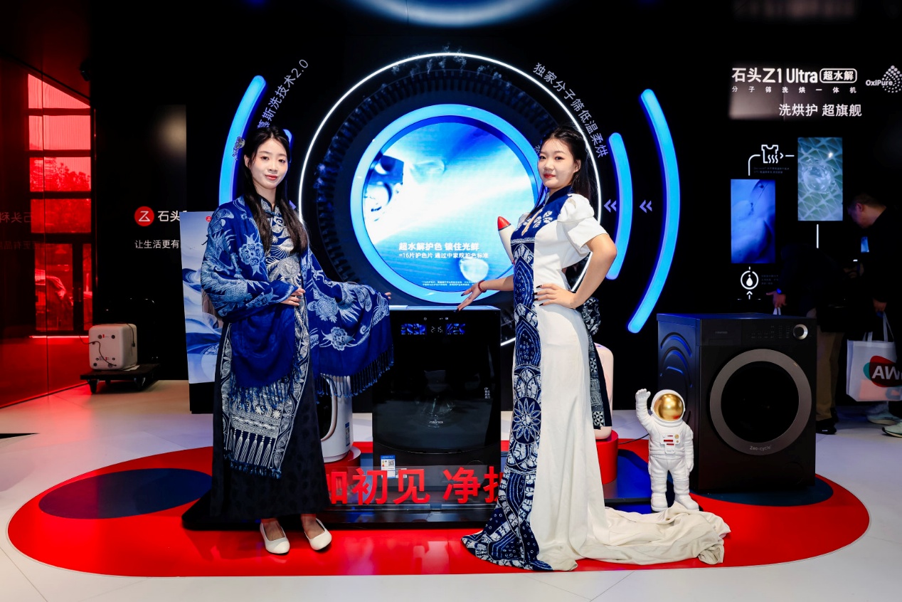 此外,是贵州苗族非遗蜡染大秀。当最前沿的工业文明遇上最古老的传统非遗,会擦出什么火花?石头结合全新发布的洗衣机Z1 Ultra,在AWE现场大胆展示了极易褪色的“非遗巨幅蜡染”洗护过程。没有任何检验报告比这种真实的演示更有说服力——用超越物理极限的洗护黑科技,留住时间与匠心的色彩。它在告诉大众:科技不只是冰冷的机器,更是传统文化的守护者。