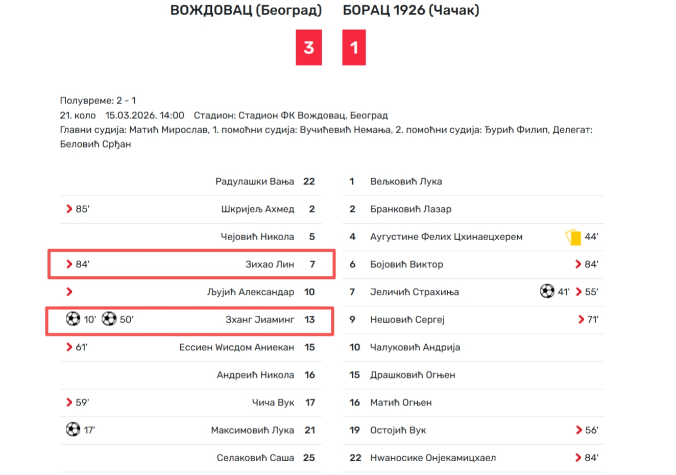 2026年3月15日,塞尔维亚U19联赛第21轮,沃日多瓦茨U19队主场3-1大胜波拉斯U19队,中国球员张家鸣首发打满全场,而且单场进了2球。数据显示,自从加盟沃日多瓦茨U19队以后,张家鸣已经首发出场3次,直接打进3球,场均进球1粒,具有非常高的进球效率。此战过后,张家鸣离拿到劳工证只剩2场比赛的距离了。按照原定计划,他再出场2次就会返回英超球队伯恩利。