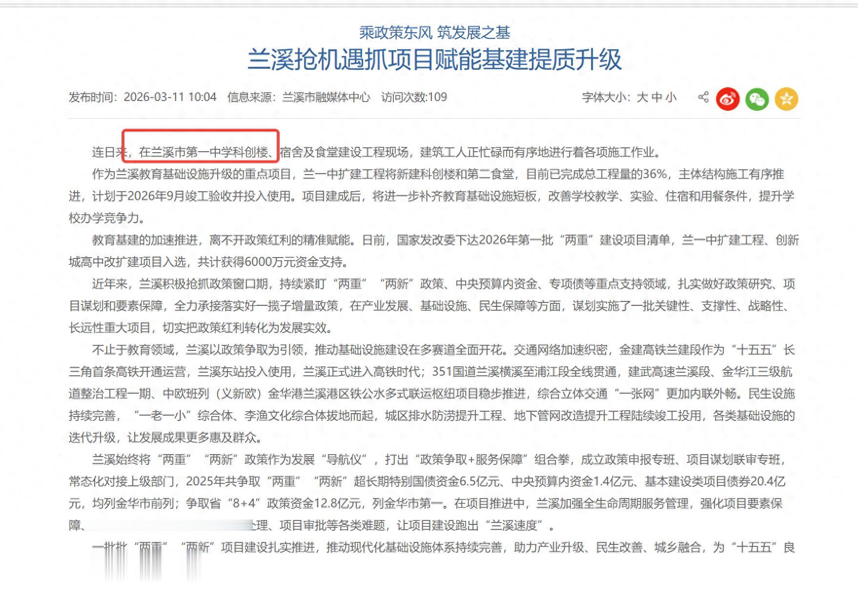 你绝对想不到,一所县级中学的扩建,竟然能惊动国家发改委,直接拿下2026年第一批“两重”建设项目的“入场券”!更让人惊讶的是,当全省乃至全国都在为资金发愁时,兰溪这所老牌名校却拿到了6000万的“真金白银”支持。