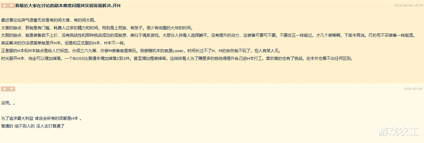 还有帖主说为什么不能开一个H本,其实本质上不是开不开H本的问题,本质是因为利益问题,为什么很多人觉得团本难度大呢?因为团本难了,金团打不过,排骨人打不过,这样就没有收益了,但是团本简单了为什么还有人抱怨呢?因为团本简单了,大家赚不到钱了,那这个时候只能抱怨了,毕竟团本简单了谁给你团双,哪怕给你团双,谁给你特定职业补贴。