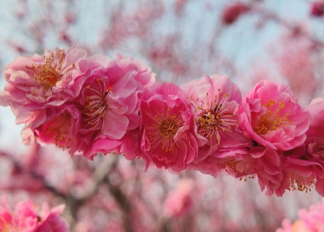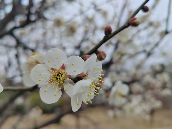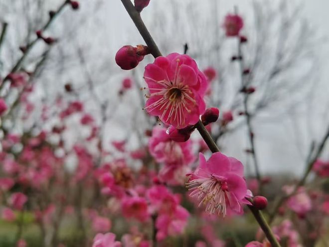 漫步梅林,红梅、朱砂梅、骨里红、绿萼梅、白梅等十余个品种沐风而开;红的热烈似火、粉的温婉如玉、白的洁净如雪、绿萼清雅脱俗,层层叠叠、错落有致。微风轻拂,花瓣轻摇,清冽幽香扑面而来,沁人心脾,尽显“俏也不争春,只把春来报”的雅致风骨。枝头繁花闹春,岸畔游人沉醉,不少市民游客结伴而来,在梅香中聆听黄河涛声,在春光里尽享生态之美。